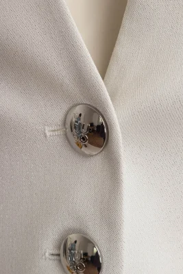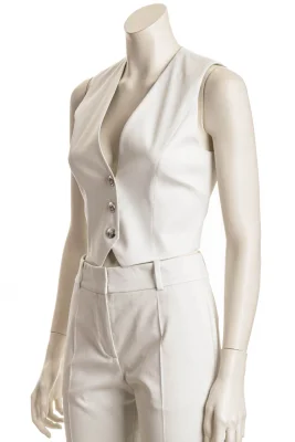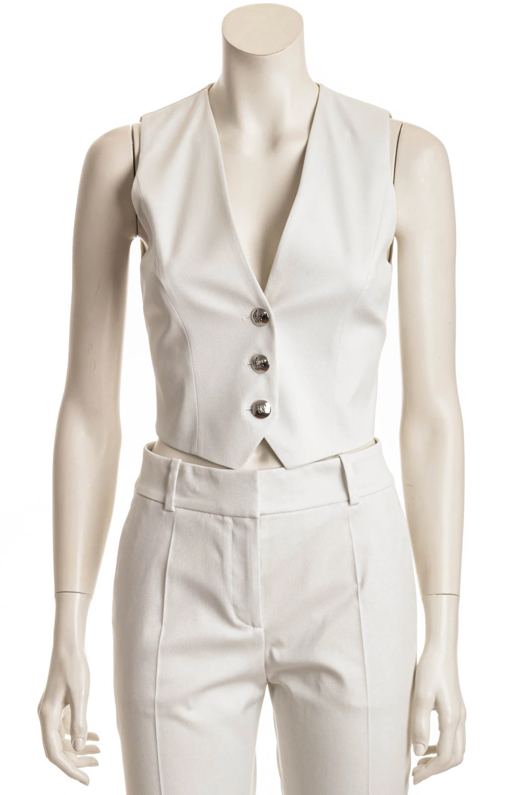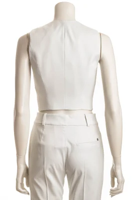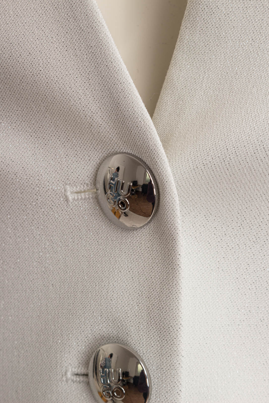 Die elegante HUGO Weste ist aus einem elastischen Material-Mix mit schimmerndem Effekt gefertigt. Moderne Cropped-Länge mit drei polierten Logo-Knöpfen.