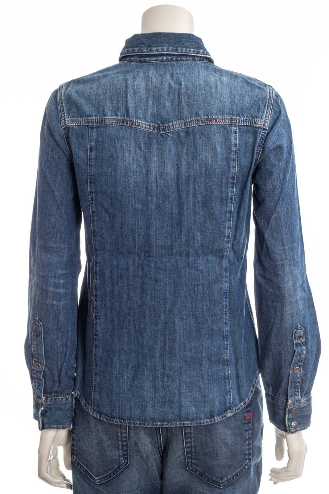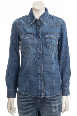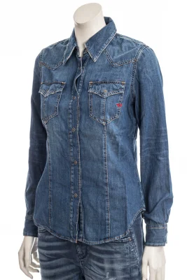 Bluse aus Denim für Damen in geradem Schnitt mit Druckknöpfen aus Metall und Western-Details. Aus 100 % Baumwolldenim mit Anteil an Recyclingbaumwolle. Hellblaue Waschung in natürlich vielgetragener Optik.