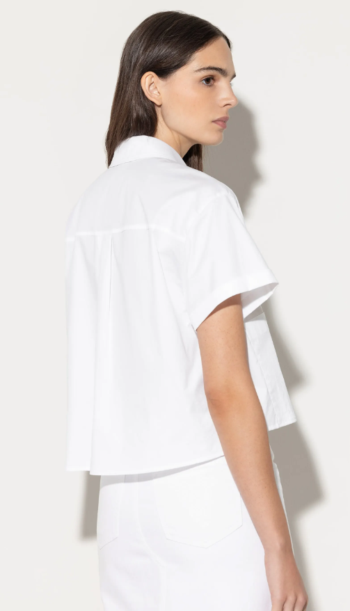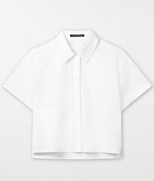 Kurze, kastenförmig geschnittene Bluse aus fein gewebtem Gabardine-Stretch-Gewebe mit verdeckter Knopfleiste und zwei aufgesetzten Taschen. Die angeschnittenen Ärmel haben einen Umschlag. Der Saum ist seitlich geschlitzt.