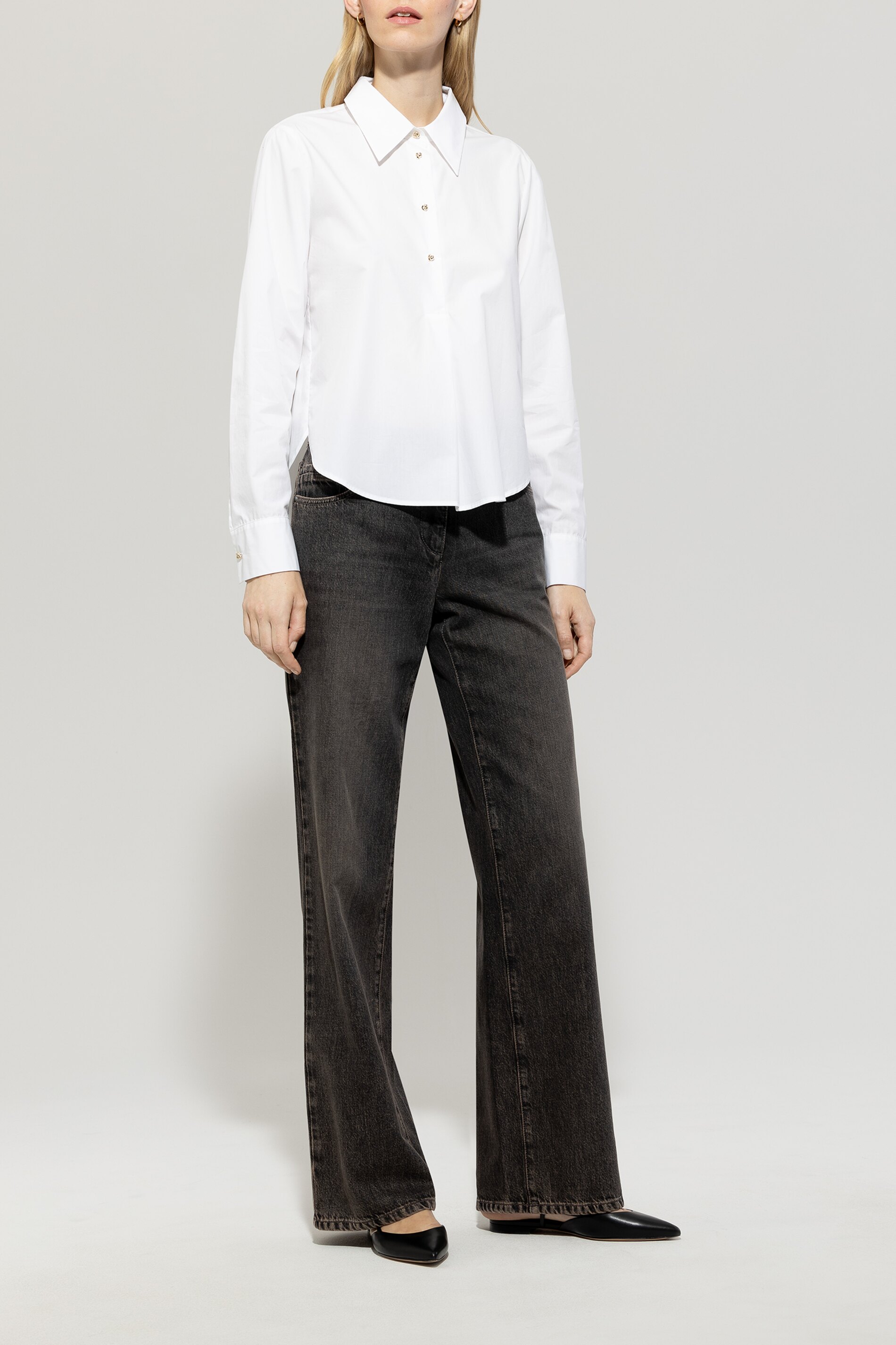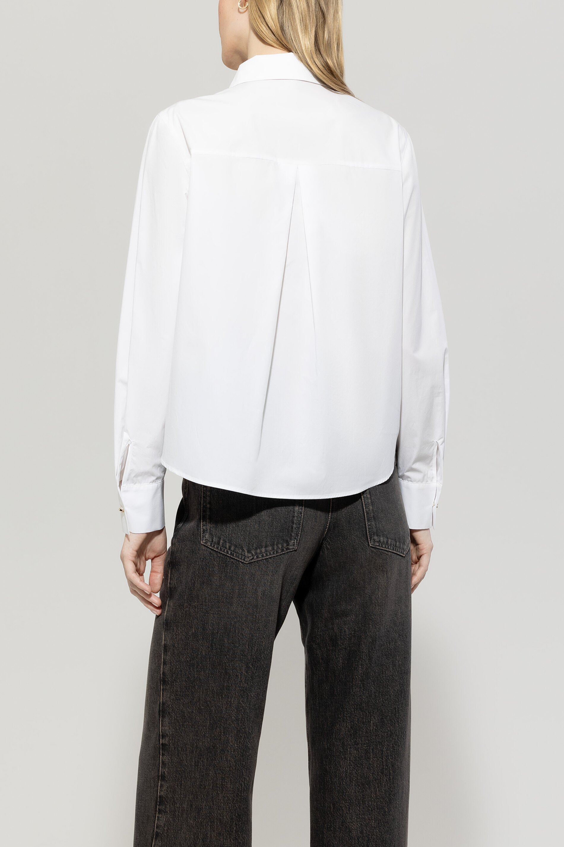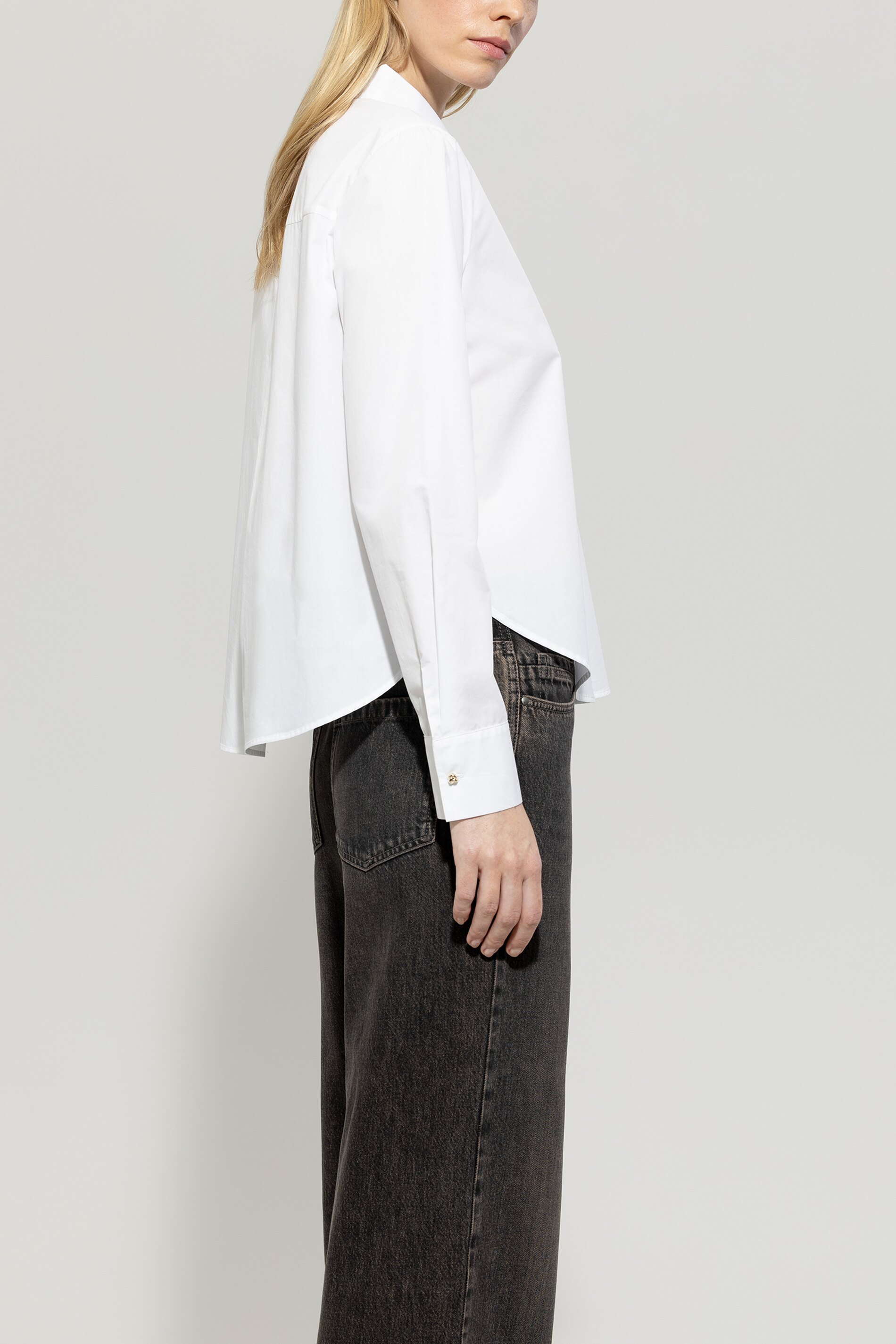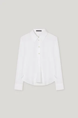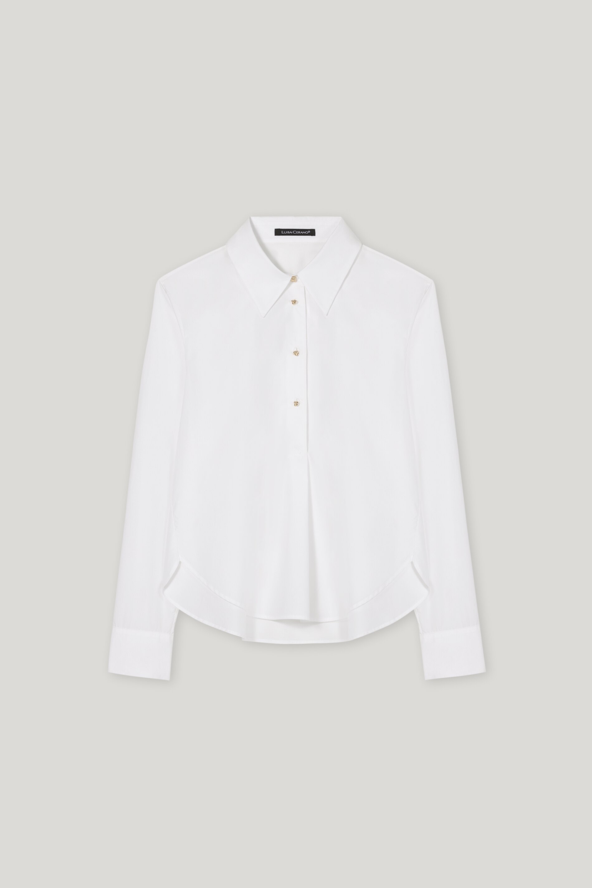 Sportliche-elegante Tunikabluse aus reiner Baumwolle mit abgerundetem, seitlich geschlitztem Saum. Highlight sind die goldfarbenen Knöpfe in Knotenform, die die halbe Knopfleiste und die Ärmelmanschetten zieren.