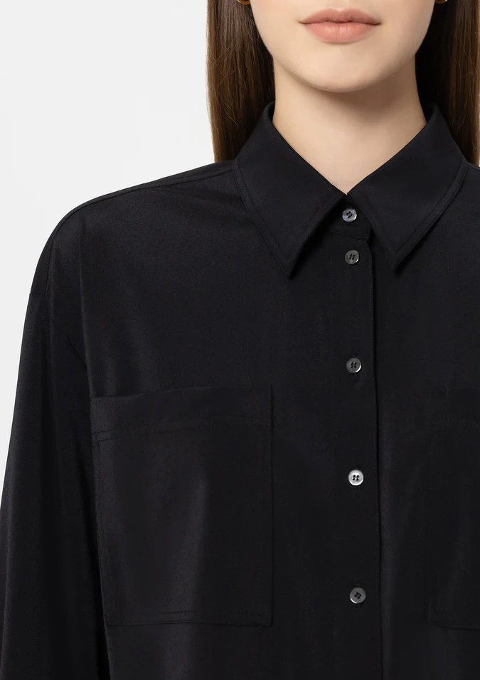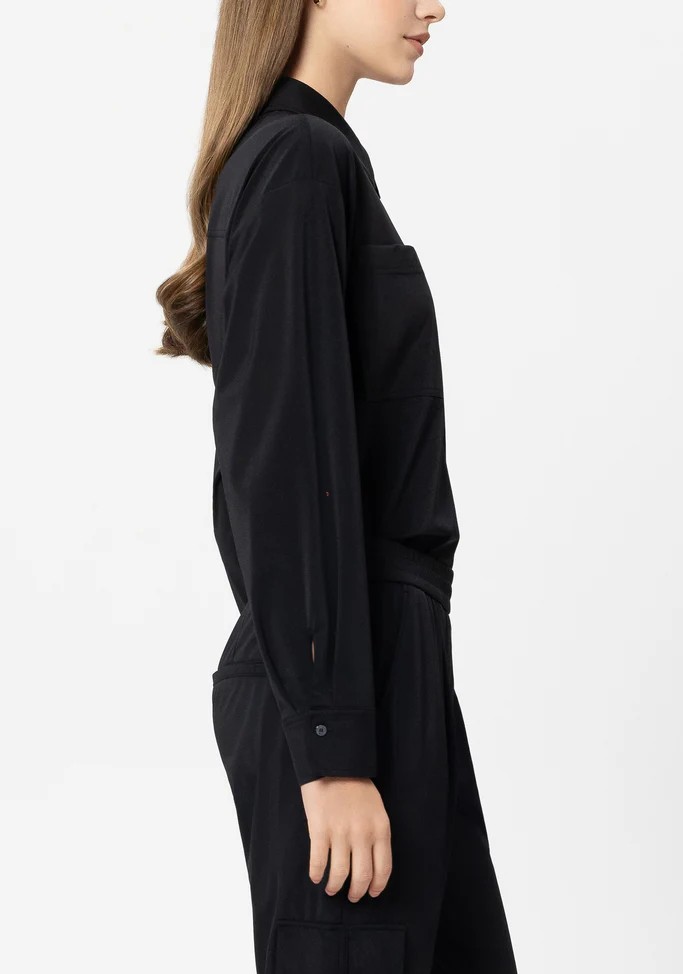 Kurze, kastig geschnittene Hemdbluse aus weichem Stretch-Jersey mit durchgehender Knopfleiste und RĂĽckenfalte. Auf der Vorderseite sind zwei groĂźe Taschen aufgesetzt.