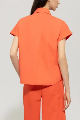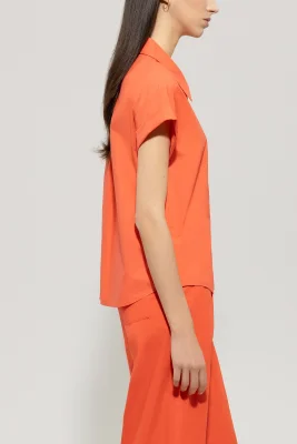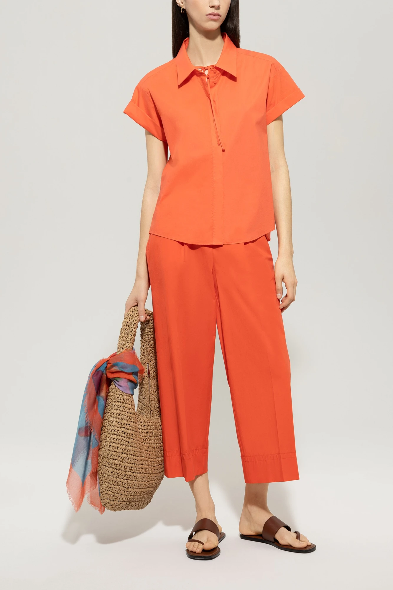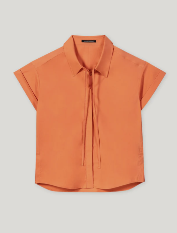 Sportive Hemdbluse aus reiner Baumwolle mit verdeckter Knopfleiste, Seitenschlitzen und feinem Bindeband am Kragen. Die kurzen Ärmel haben eine umgeschlagene Kante.