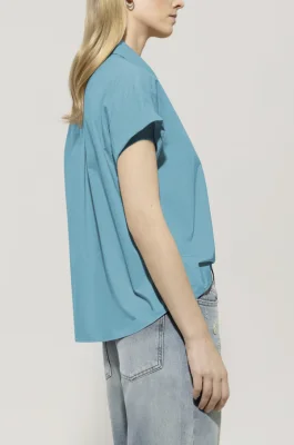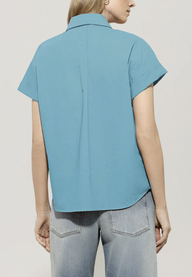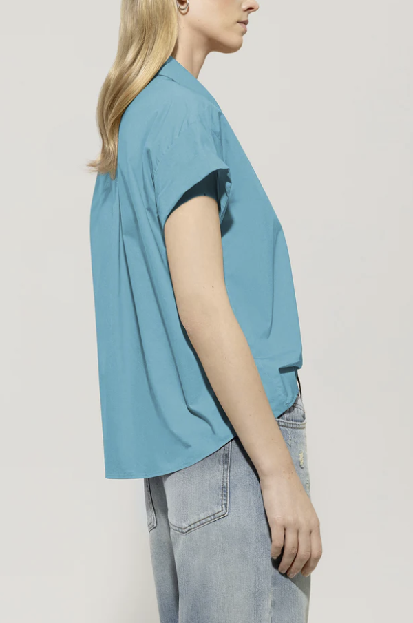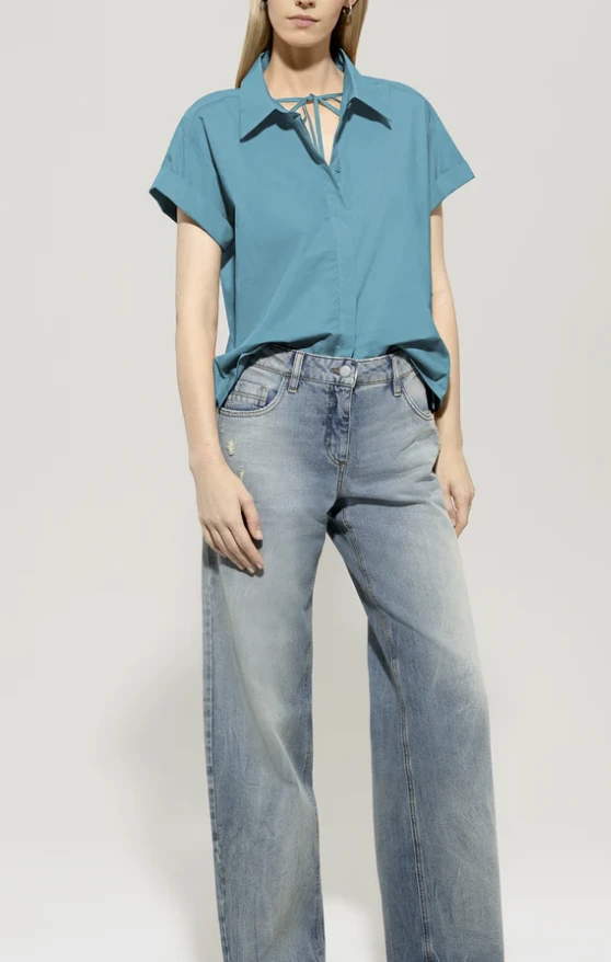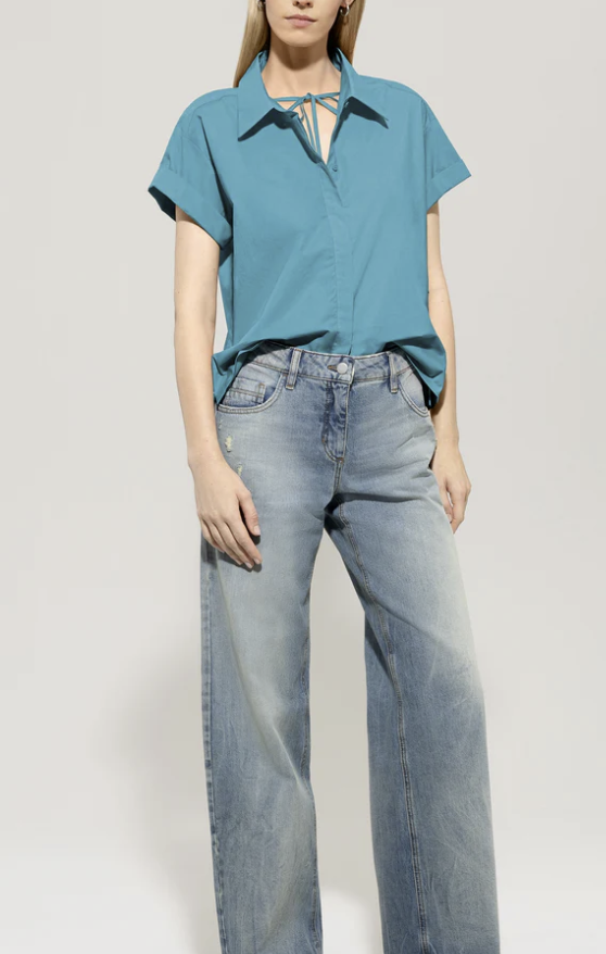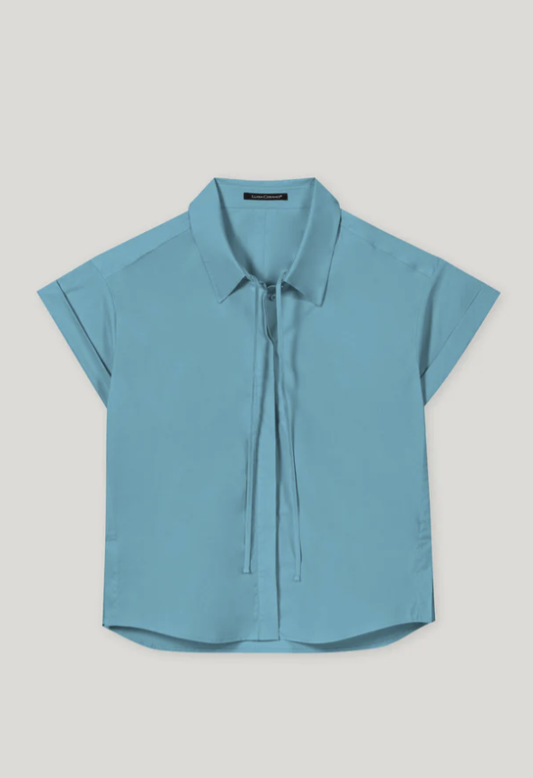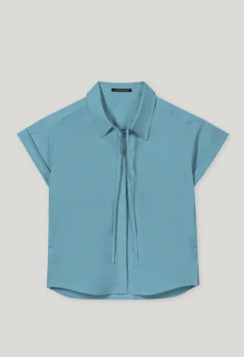Sportive Hemdbluse aus reiner Baumwolle mit verdeckter Knopfleiste, Seitenschlitzen und feinem Bindeband am Kragen. Die kurzen Ärmel haben eine umgeschlagene Kante.