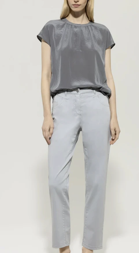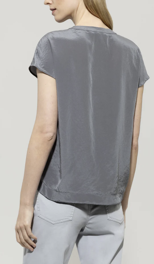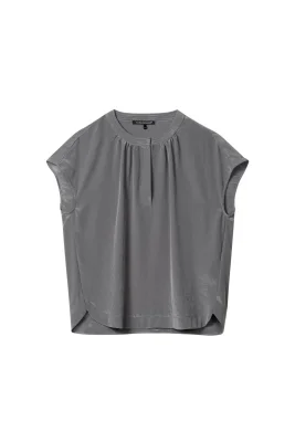 Blusentop aus edel glänzender Techno-Seide aus Recyclingmaterial in legerer Silhouette mit leicht überschnittenen Schultern. Der feminine Tunika-Ausschnitt ist mit feinen Absteppungen an der Blende und am Schlitz versehen.