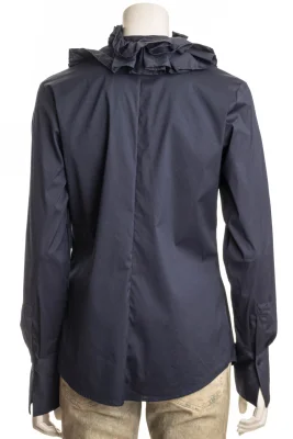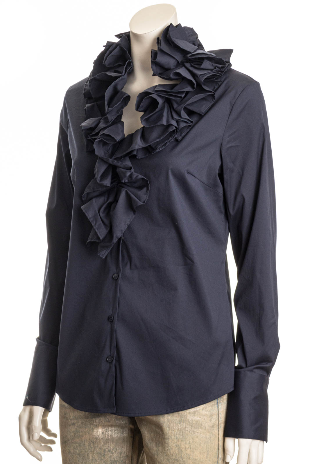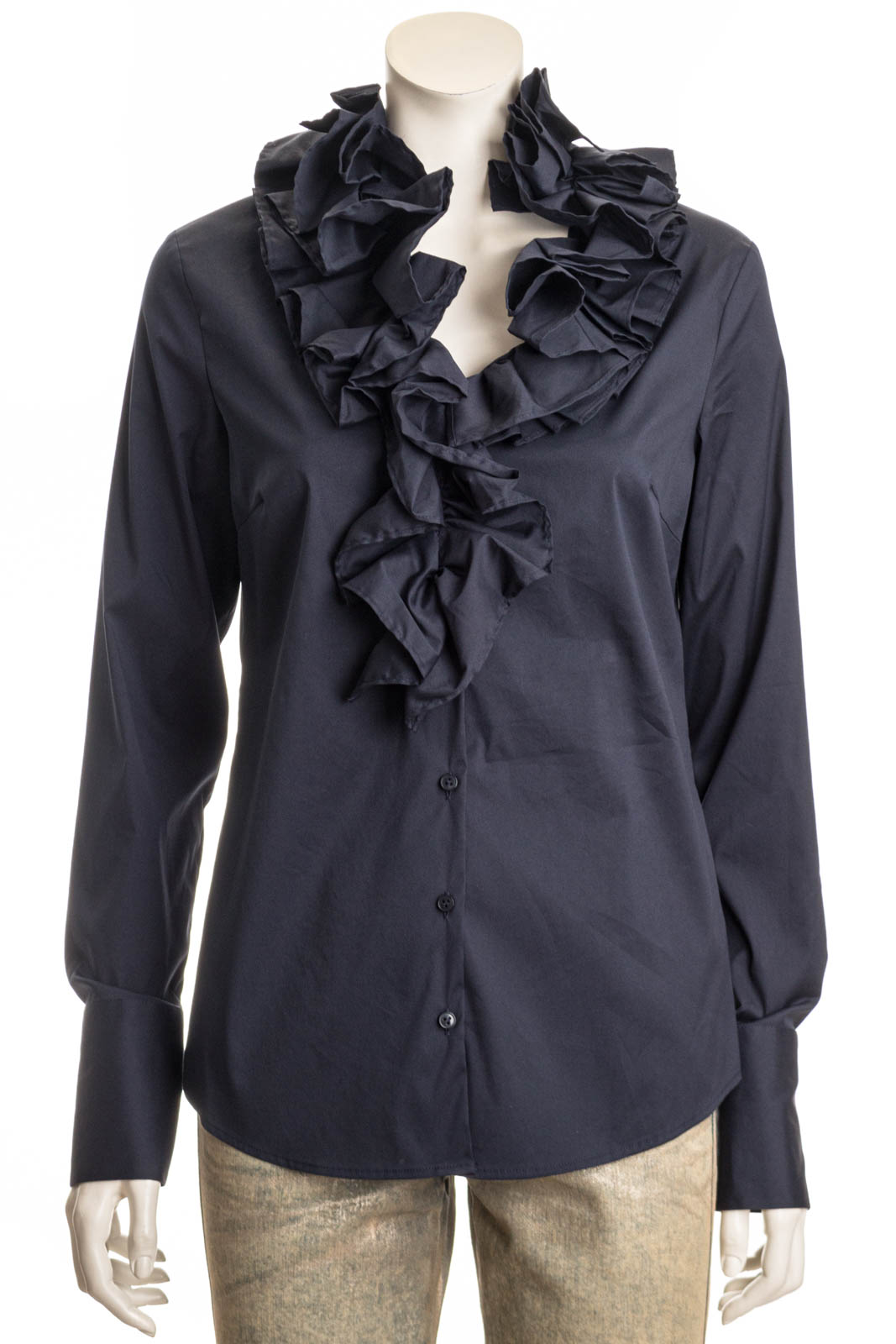 Diese taillierte Bluse bietet eine feminine Passform und betont die Silhouette. Lange Ärmel und ein eleganter Ausschnitt mit Rüschen setzen auffällige, stilvolle Akzente. Gefertigt ist sie aus einer einfarbigen Baumwoll-Stretch-Mischung, die Bewegungsfreiheit und Komfort vereint. Das Material sorgt für einen angenehmen Sitz und eine gepflegte Optik. Ideal für Büro oder besondere Anlässe.