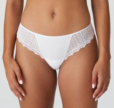 Verspielter String mit feinem Spitzenakzent an Hüfte und Rückseite. Weiß ist eine zeitlose Modefarbe, die jedes Jahr vertreten ist.