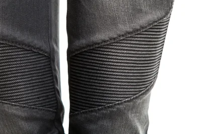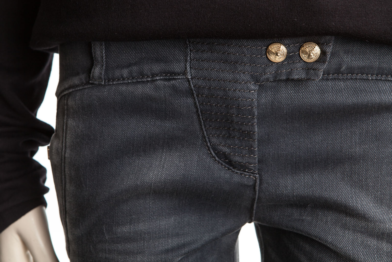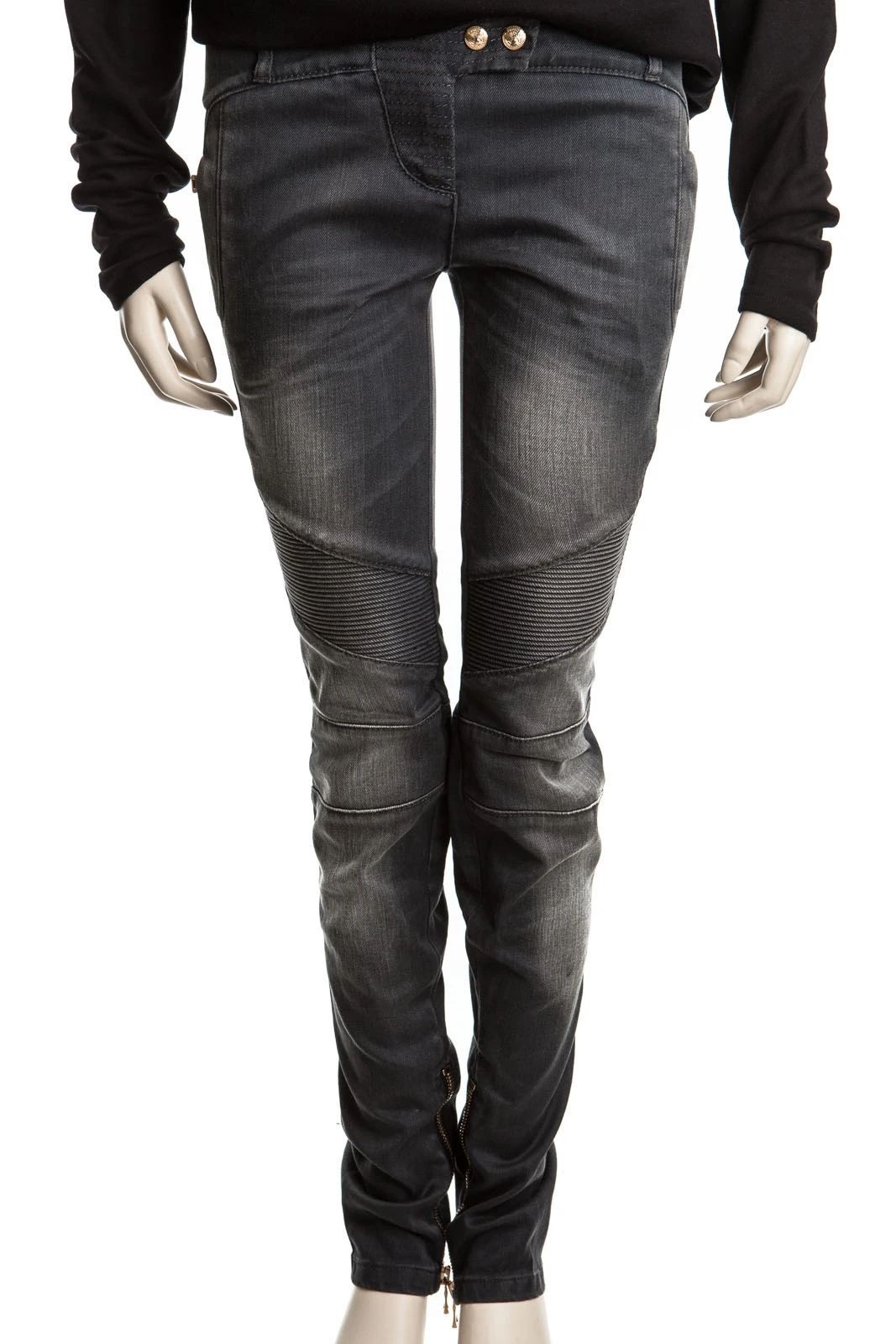 Schmall geschnittene Biker-Jeans mit goldenen Knöpfen.