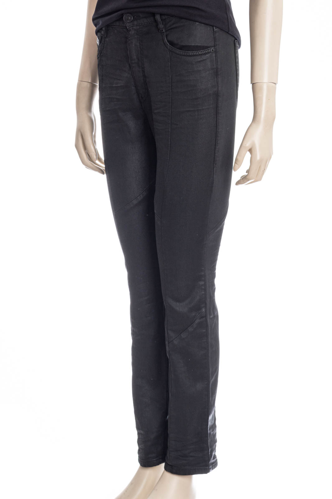 Schmal geschnittene beschichtete Jeans mit hohem Taillenbund.