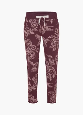 Hosenbeinabschlüsse mit Rollsaum, dekorative Overlocknähte und der klassisch gerippte Tunnelzugbund zeichnen den comfy Look der Sweatpants in Cassis aus. Als Highlight punktet der „Birds“ Allover-Print. Eine softe Fleece-Innenseite rundet den loungigen Allrounder ab.
