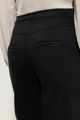 Tapered-Pants aus Colour-Denim in High-Stretch-Qualität mit Knopf- und Reißverschluss. Die Taschen sind mit dekorativen Lederpaspeln und Nietendetails besetzt.