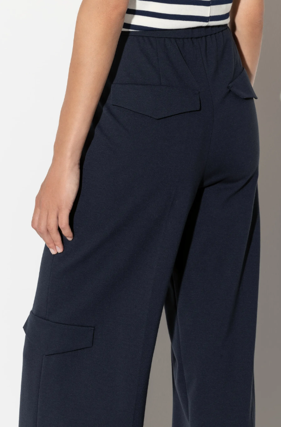 Weit geschnittene Hose mit seitlichen Eingrifftaschen und angedeuteten Cargo-Elementen. Der elastische Bund und das weiche, elastische Punto-Milano-Material machen die Hose besonders bequem.