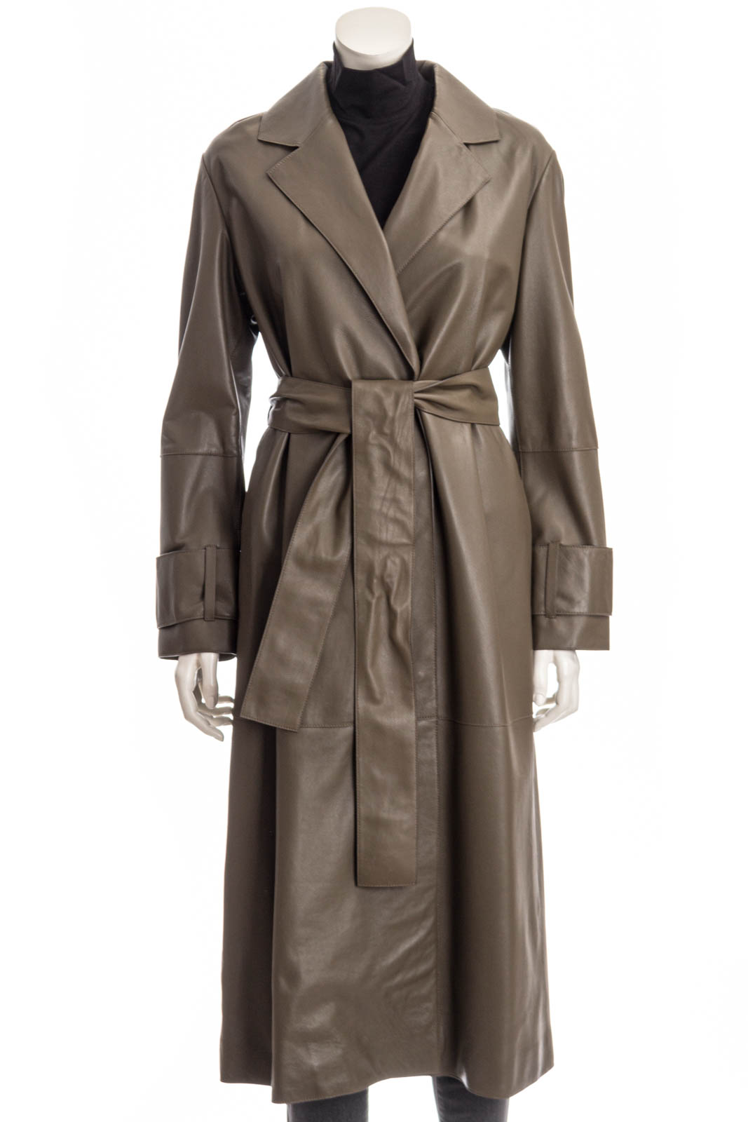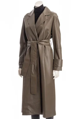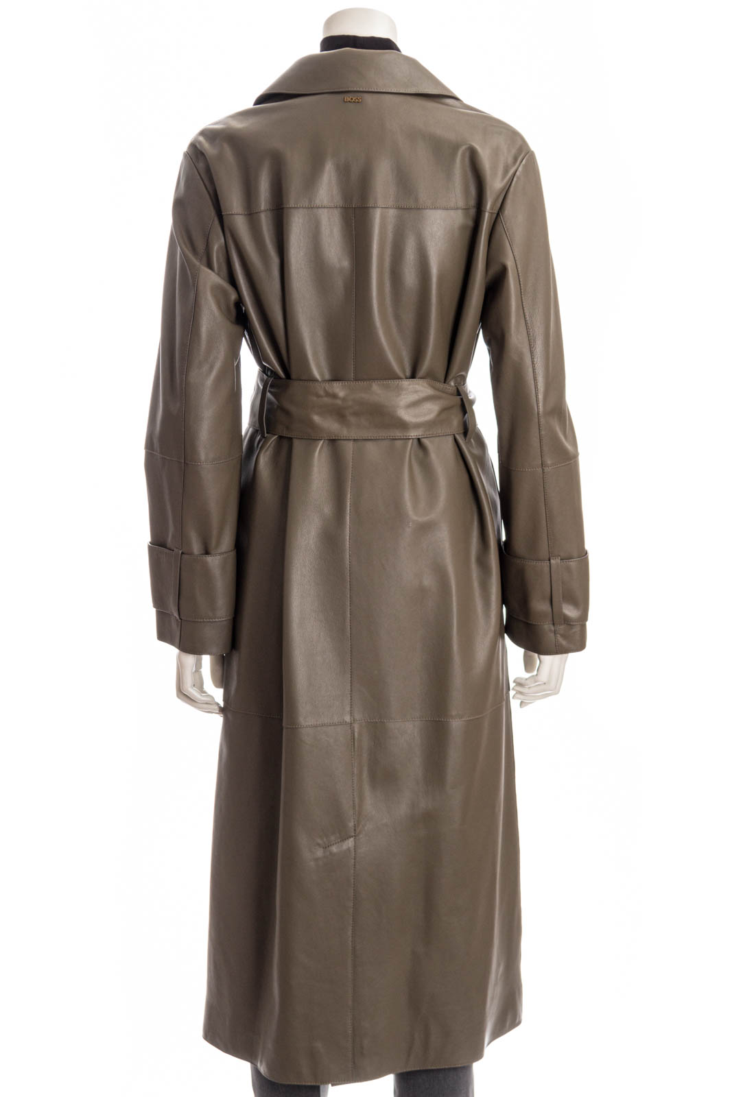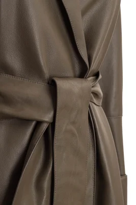 Eleganter BOSS Mantel aus softem Nappaleder mit Gürtel, fallendem Revers und charakteristischem Innenfutter.