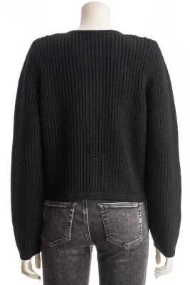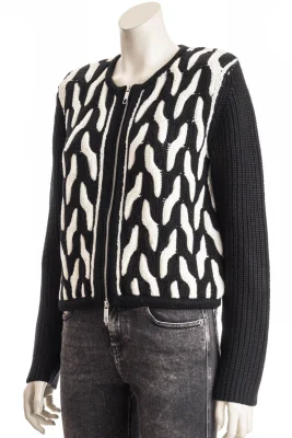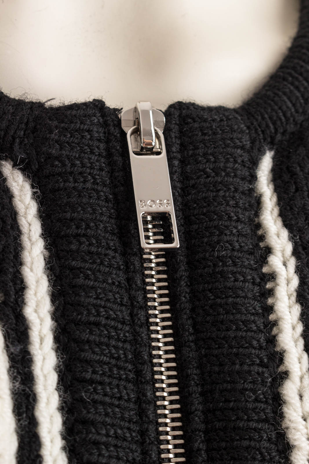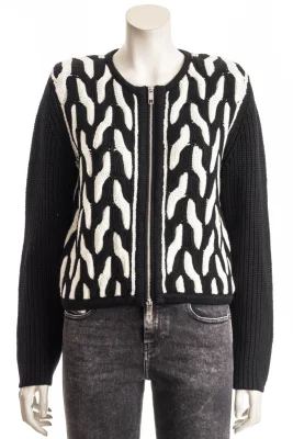 Markante kurze BOSS Strickjacke mit Reißverschluß. Sie ist mit einem zweifarbigen Zopfmuster gestrickt.