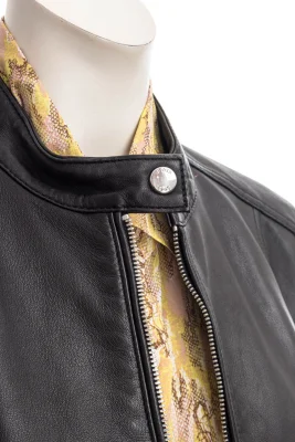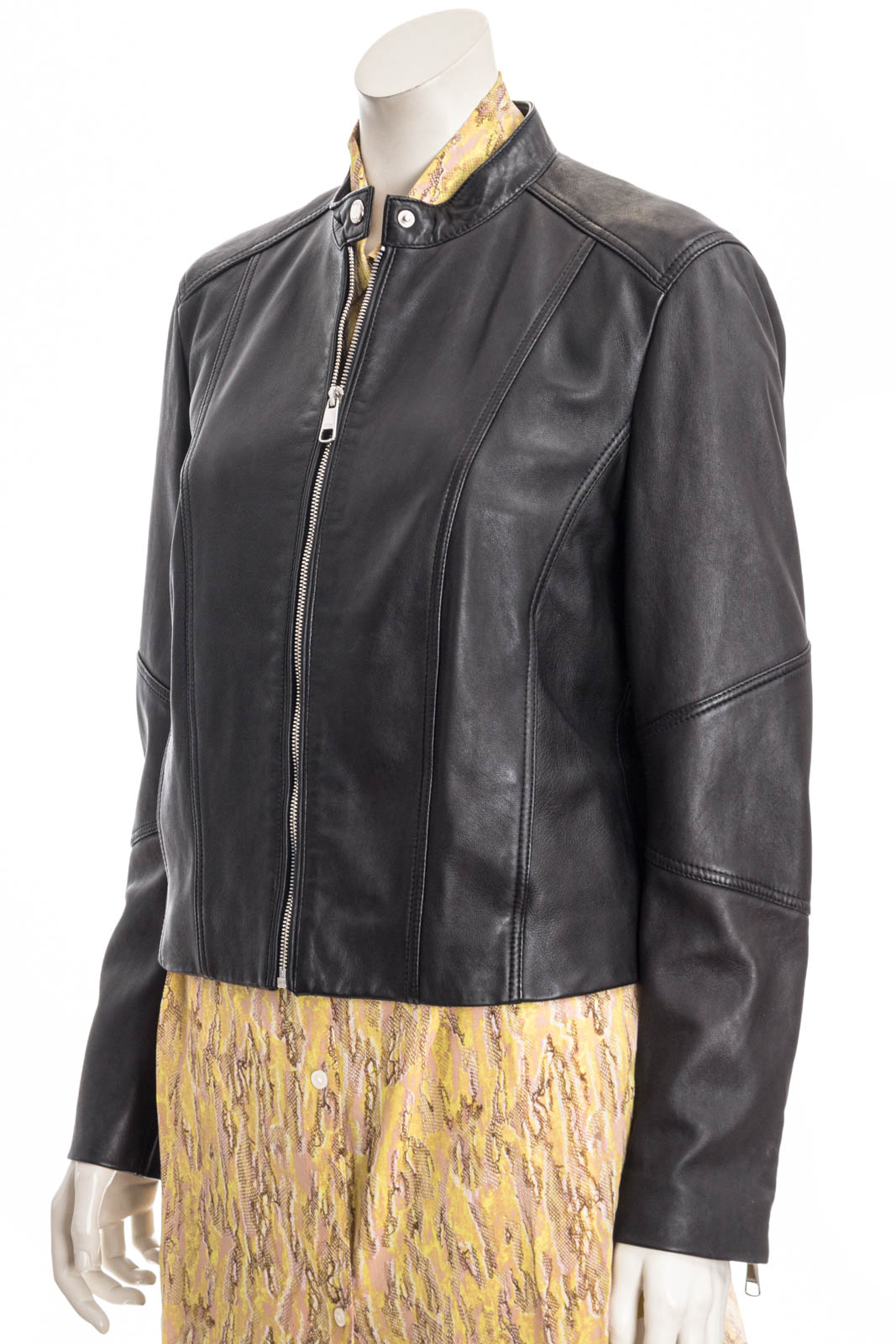 Kragenlose BOSS Jacke aus edlem Leder, die sich mit einer schmalen Passform, Logo-Details und einem Reißverschluss auf der Vorderseite präsentiert.