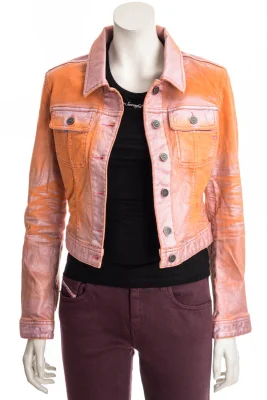 Aus Stretch-Denim in einzigartiger, zweifarbiger Waschung in poppigen Tönen. Der Stoff ist laminiert, orange gefärbt und laser-behandelt und zeigt so das kontrastierende Pink-Metallic.