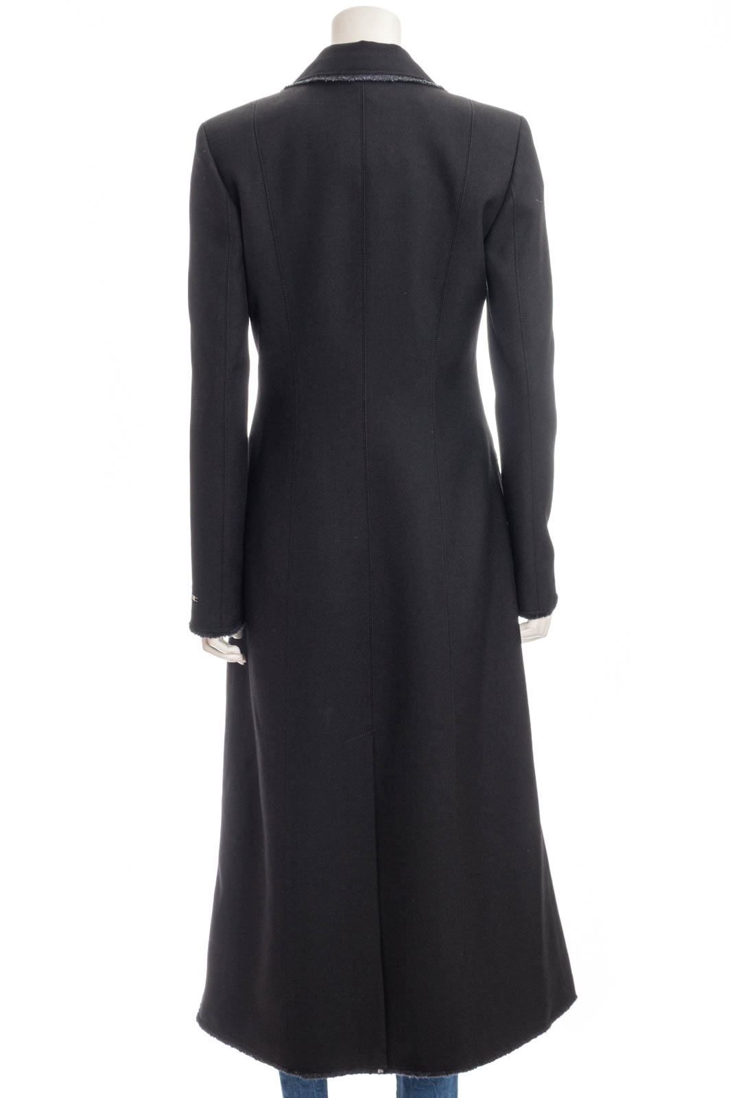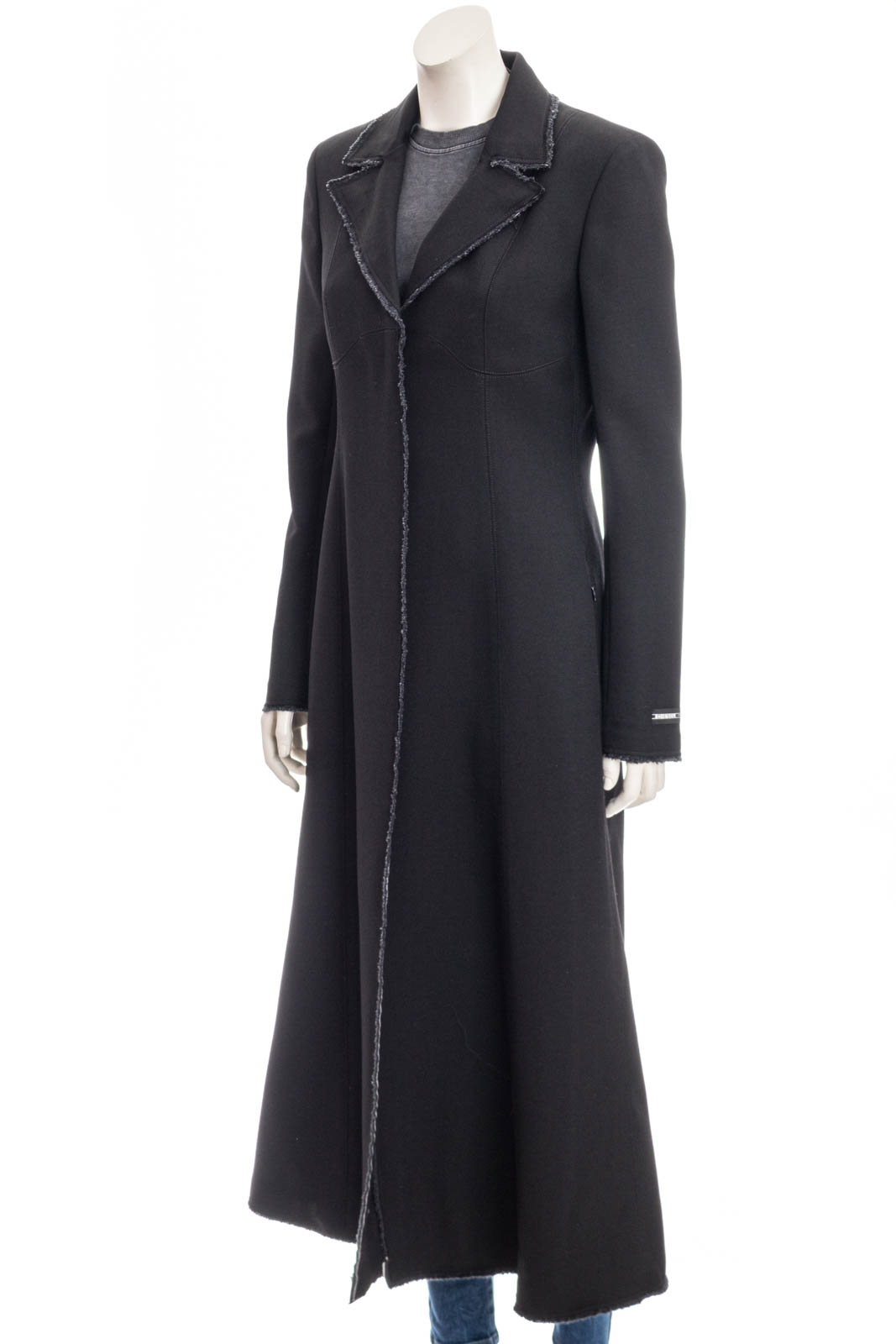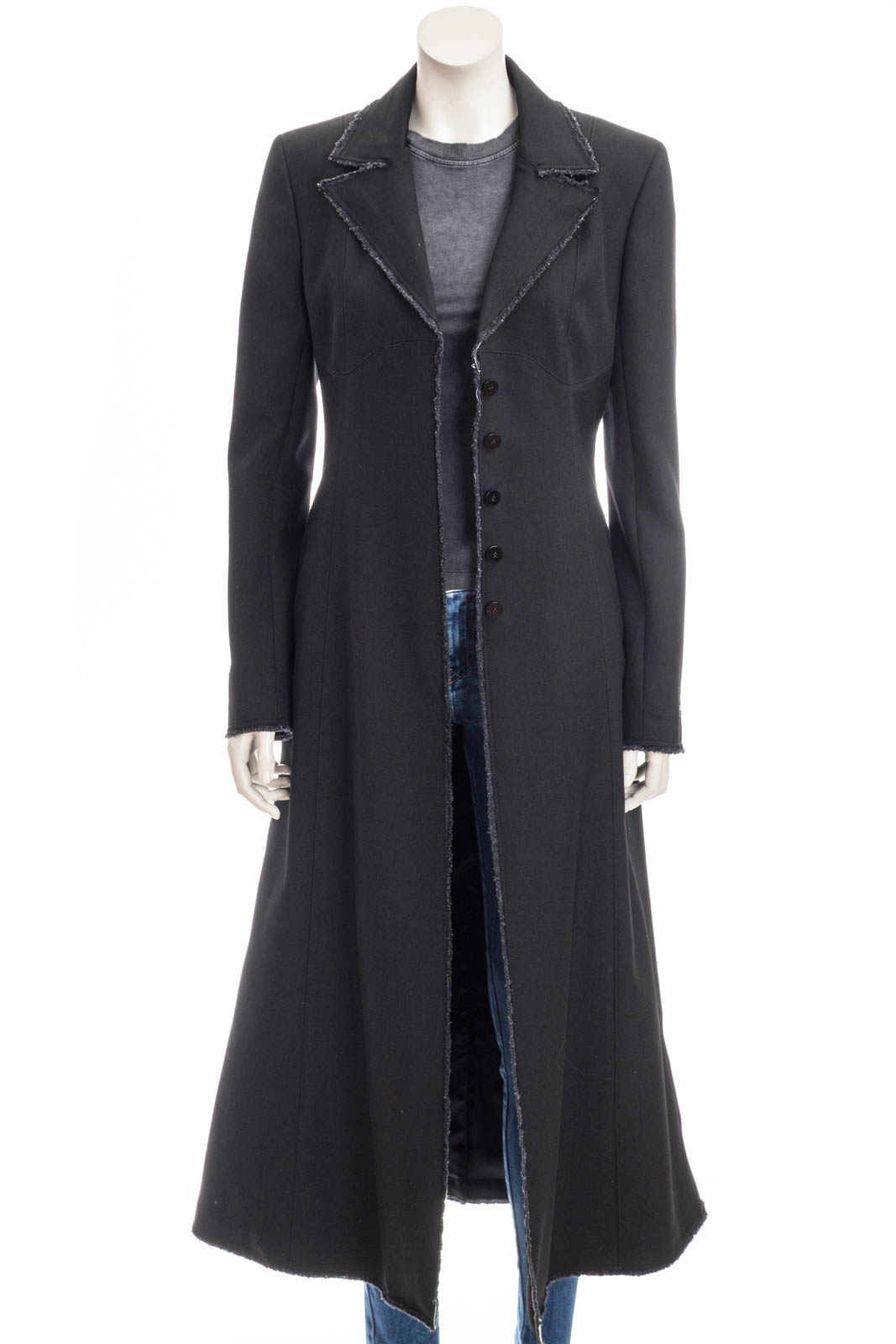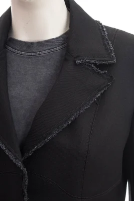 Schmal geschnittener langer Mantel mit ausgestellten Schultern und raffinierten ausgefransten Nähten.