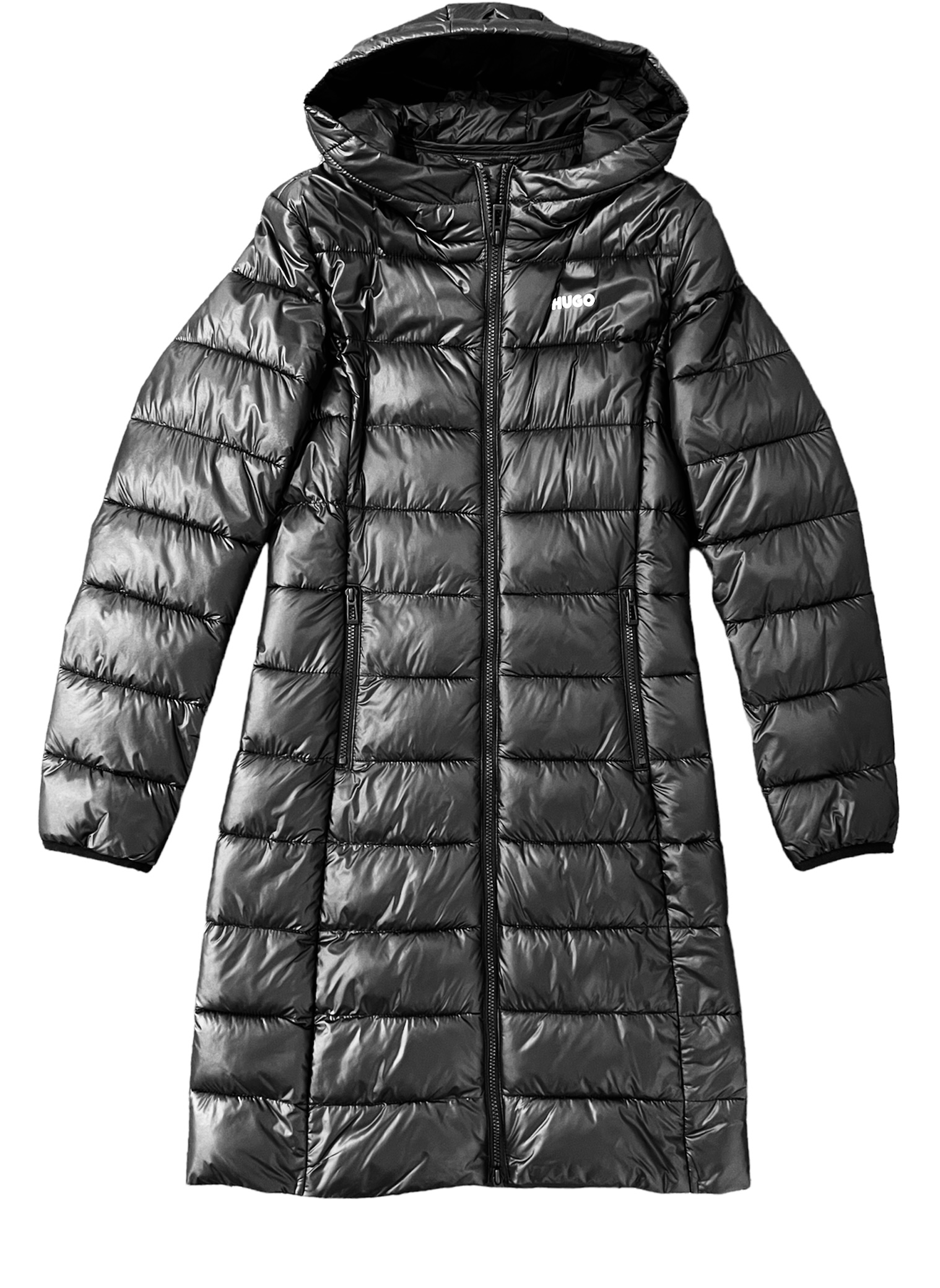Die lange Damen-Jacke ist aus einem leichten Material-Mix mit wasserabweisendem Finish gefertigt und mit einem Zwei-Wege-ReiĂźverschluss ausgestattet. Auf der Brust befindet sich ein HUGO Logo-Print.
