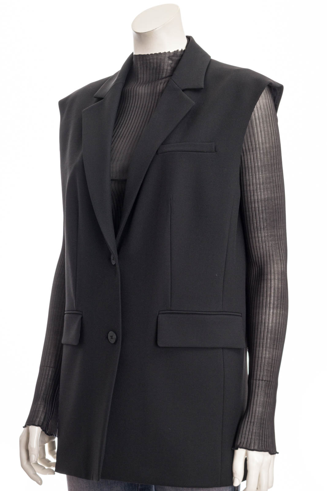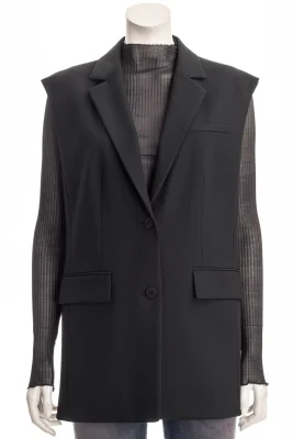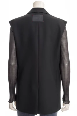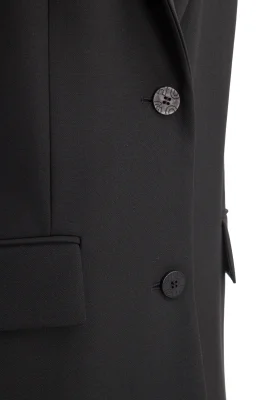 Gerade geschnittene HUGO Weste mit Longline-Passform. Die zeitgemäße Damen-Weste aus einem elastischen Material-Mix hat eine einreihige Knopfleiste, breite Schultern, Pattentaschen und ein fallendes Revers. Ein durchgehendes Innenfutter mit HUGO Logos rundet den Style ab.