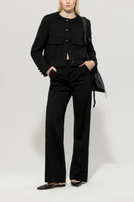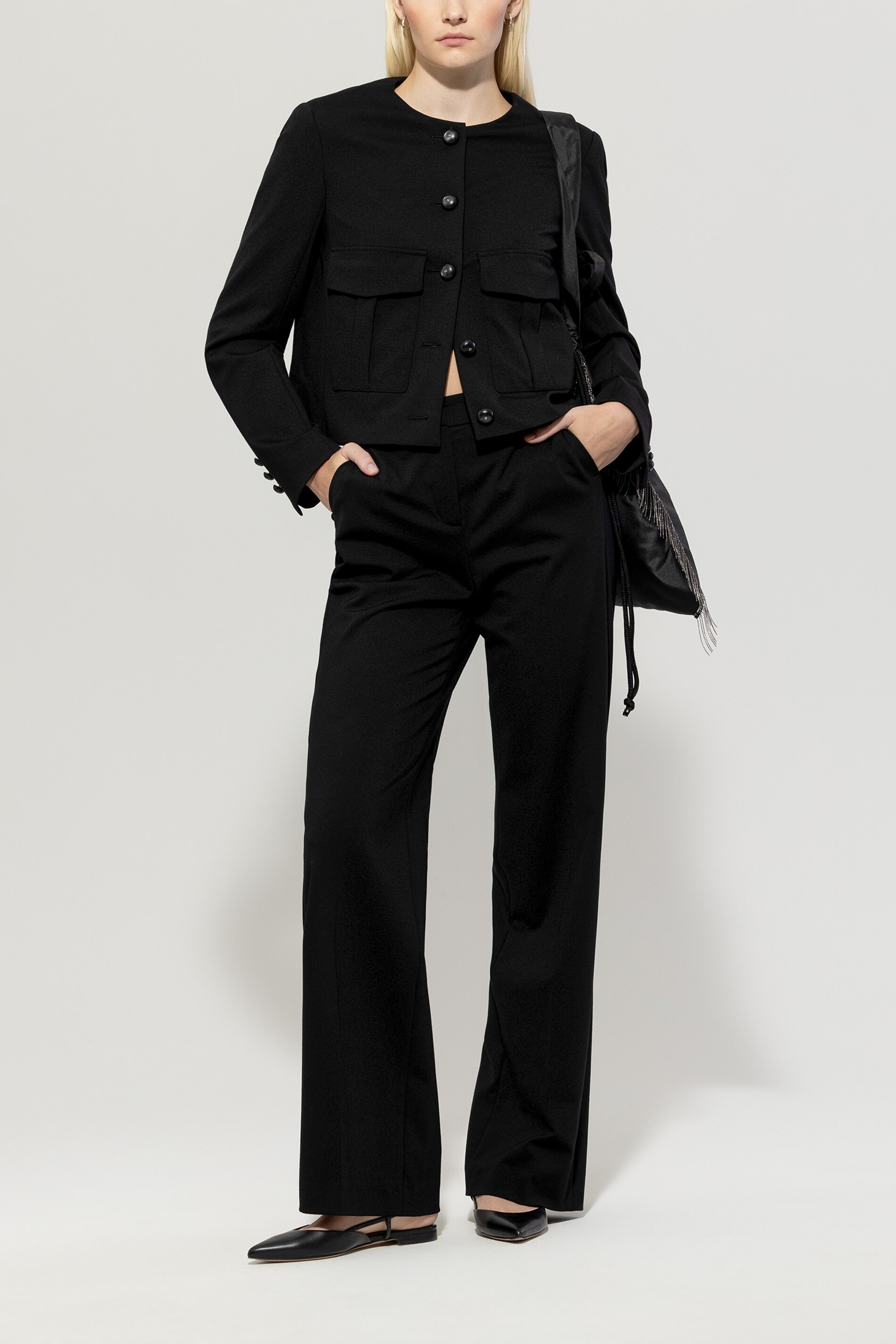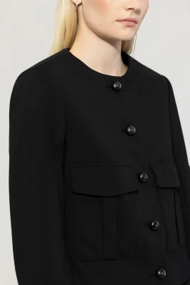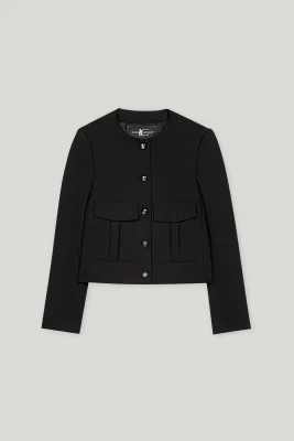 Kurze, kragenlose Jacke aus Punto-Milano-Gewebe mit aufgesetzten Pattentaschen. Die Knopfleiste und die Ärmelabschlüsse sind mit markanten Zierknöpfen ausgestattet.