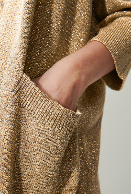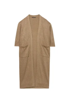 Langer Cardigan aus glamourös schimmerndem Tape Yarn auf Baumwoll-Basis. Der lässig geschnittene Eyecatcher ist mit halblangen Ärmeln und aufgesetzten Eingrifftaschen ausgestattet.