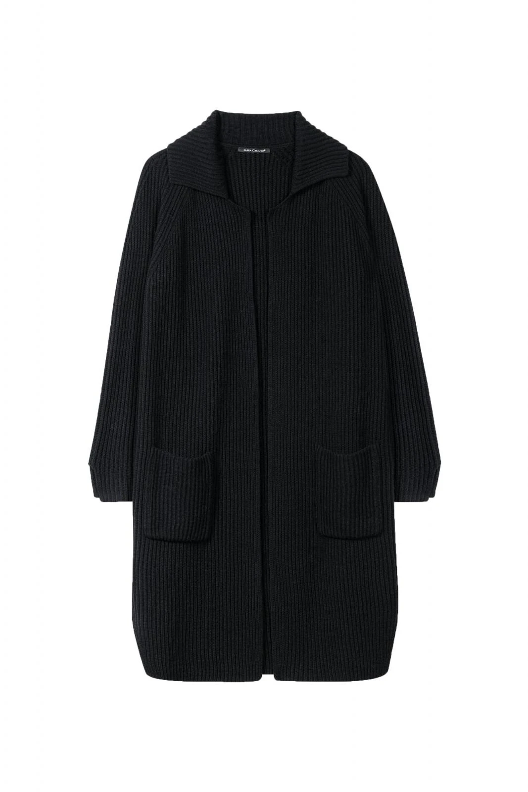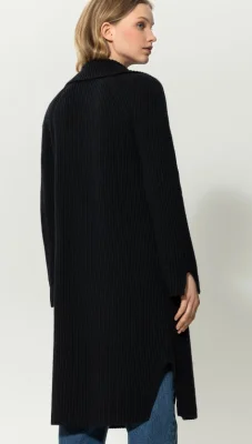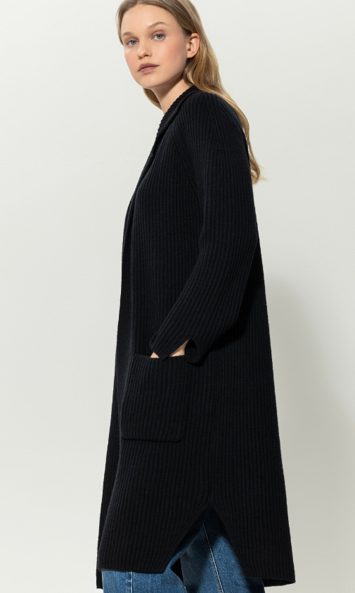 Offener Strickmantel aus leichter Wollmischung in ausdrucksstarker Rippstruktur. Ärmel und Saum sind seitlich geschlitzt. Ein Reverskragen und zwei aufgesetzte Taschen komplementieren das Design.