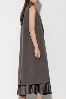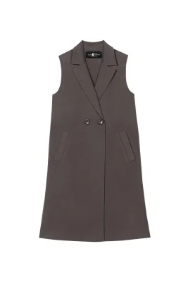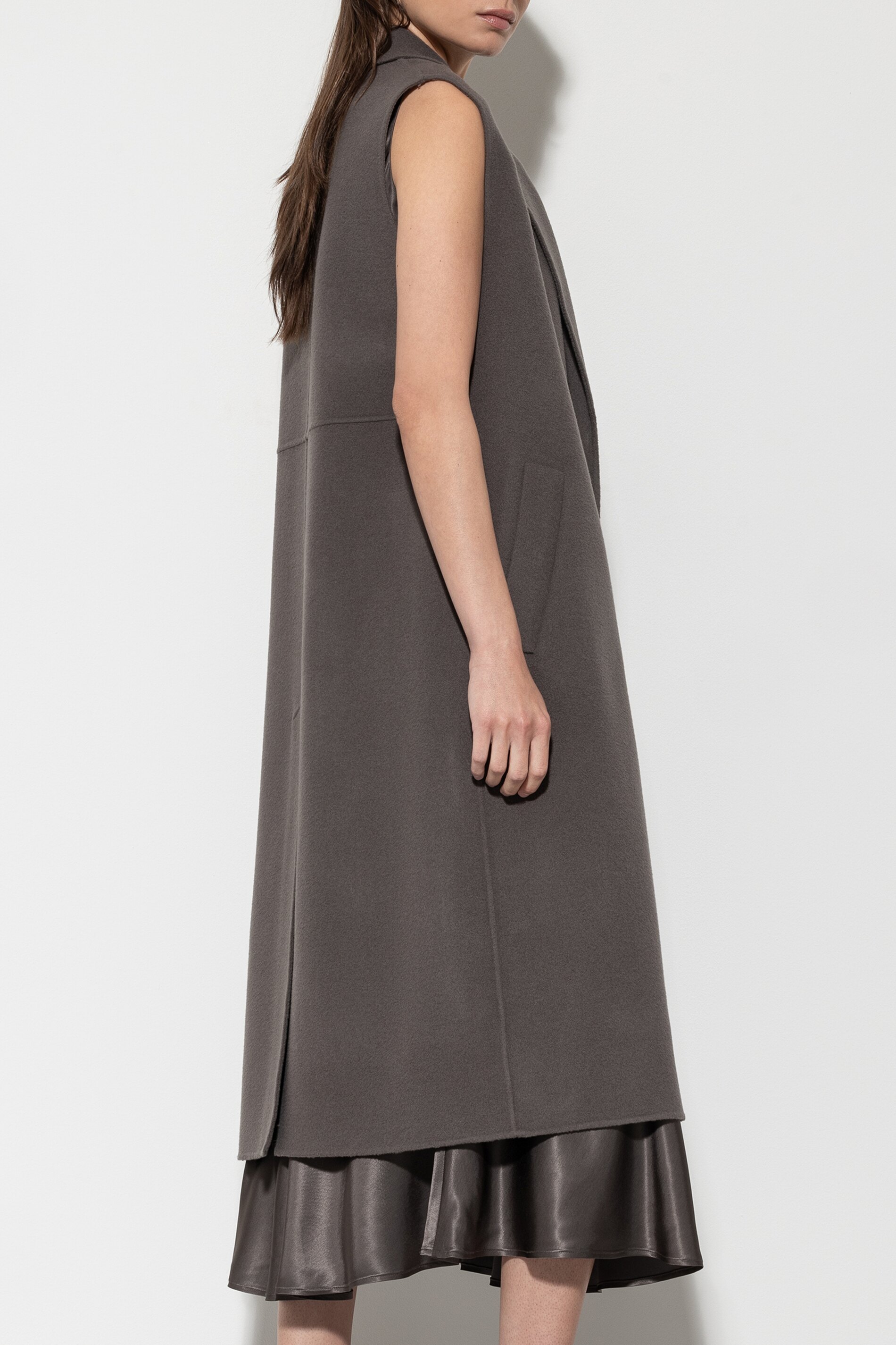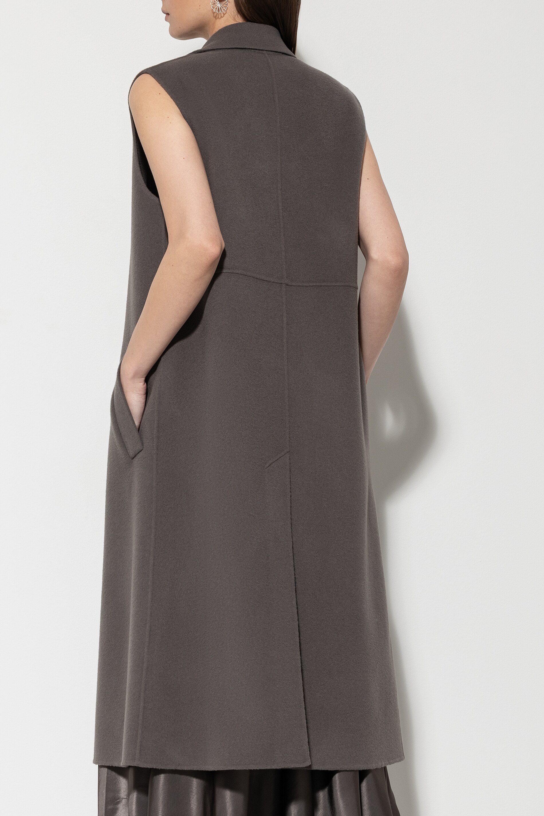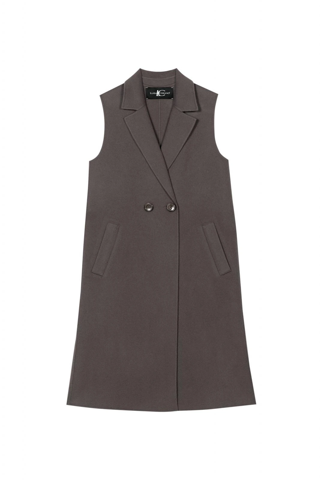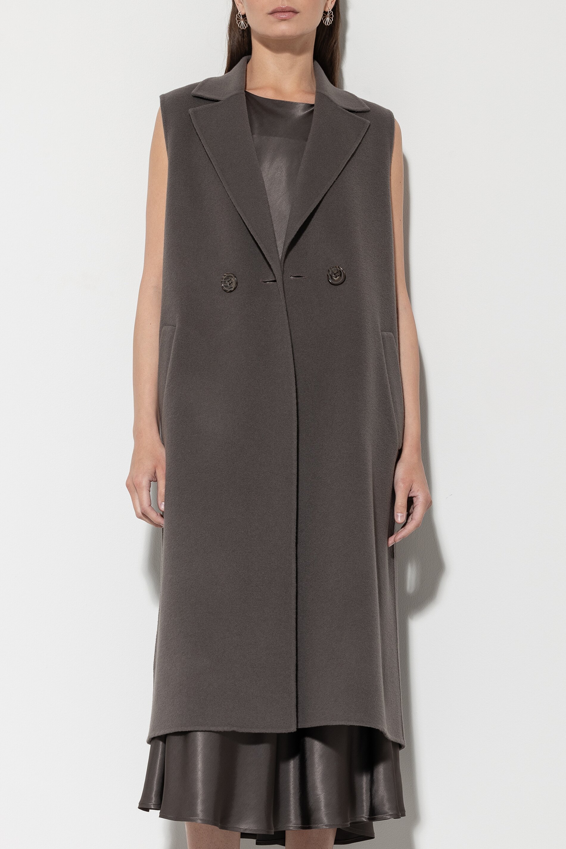 Lange Mantelweste in hochwertiger Handmade-Doubleface-Verarbeitung aus einem Wolle-Kaschmir-Mix. Die Weste ist im klassischen Design mit einem Reverskragen, zwei Taschen und einem zweireihigen Knopfverschluss gestaltet.