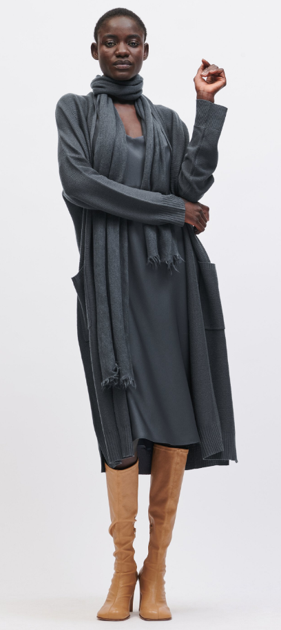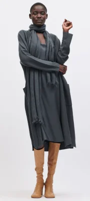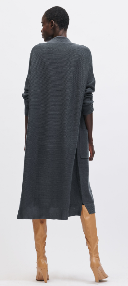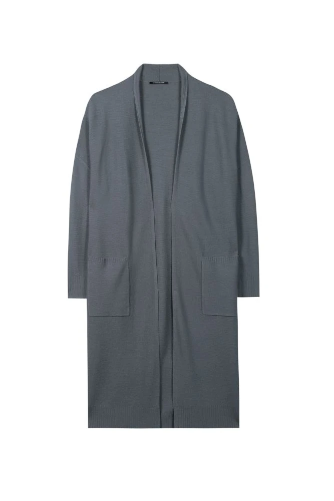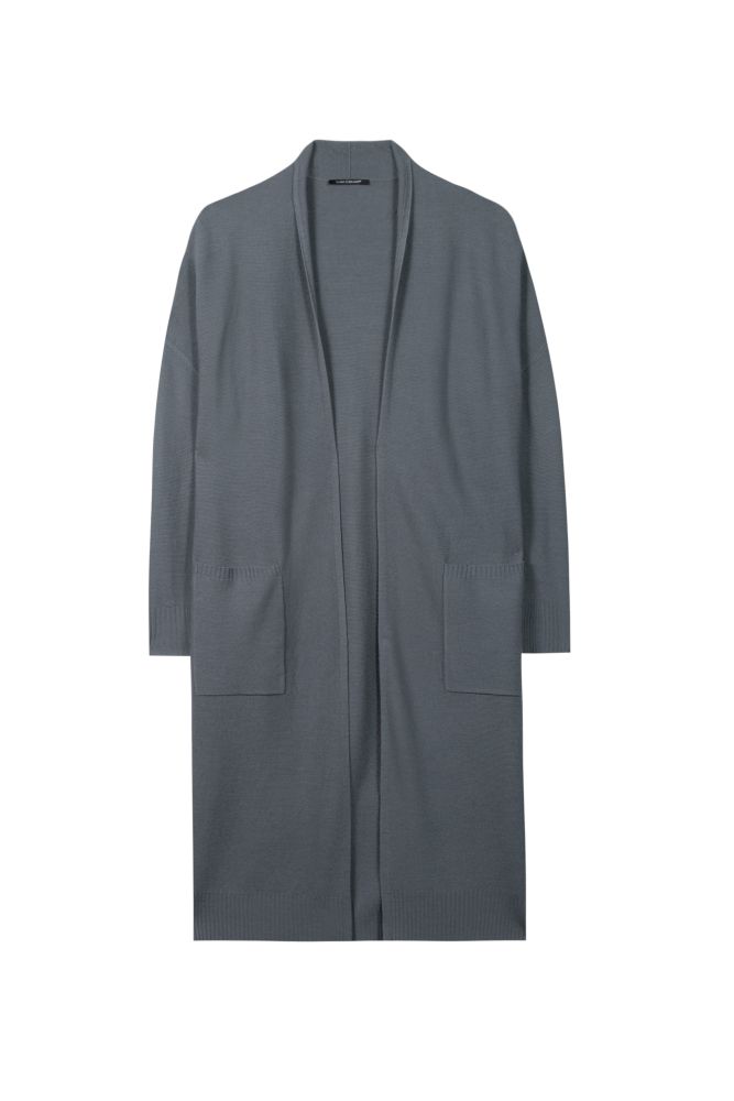 Langer Strickmantel aus leichtem Wollmix-Garn mit hochwertiger Links-Links-Struktur. Der lässige Mantel besitzt eine offene Silhouette mit angeschnittenem Kragen, gerippten Abschlüssen und aufgesetzten Eingrifftaschen.