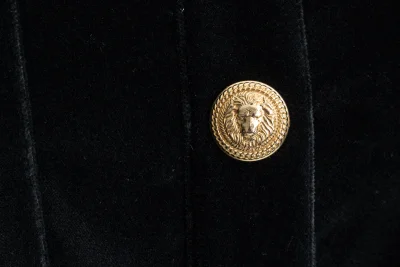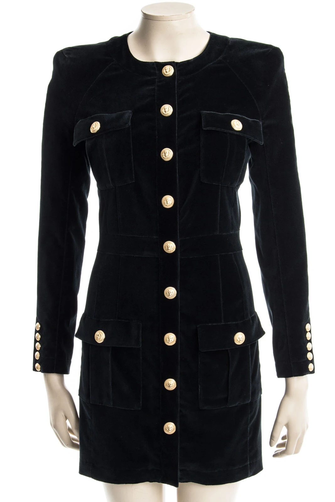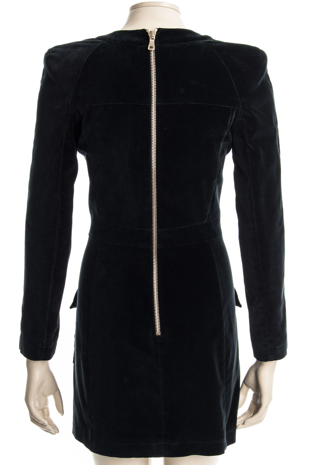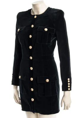 Modisches Kleid aus exklusivem Samt mit BALMAIN Typischen Schulterpolstern und goldfarbenden Knöpfen.