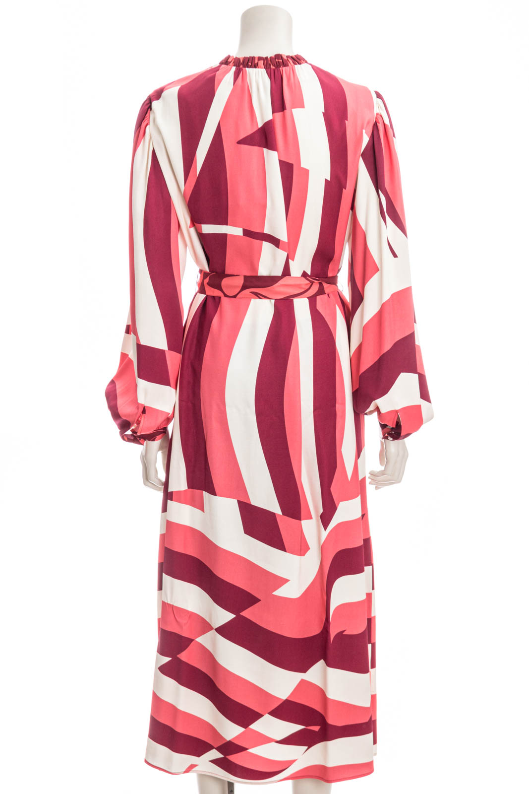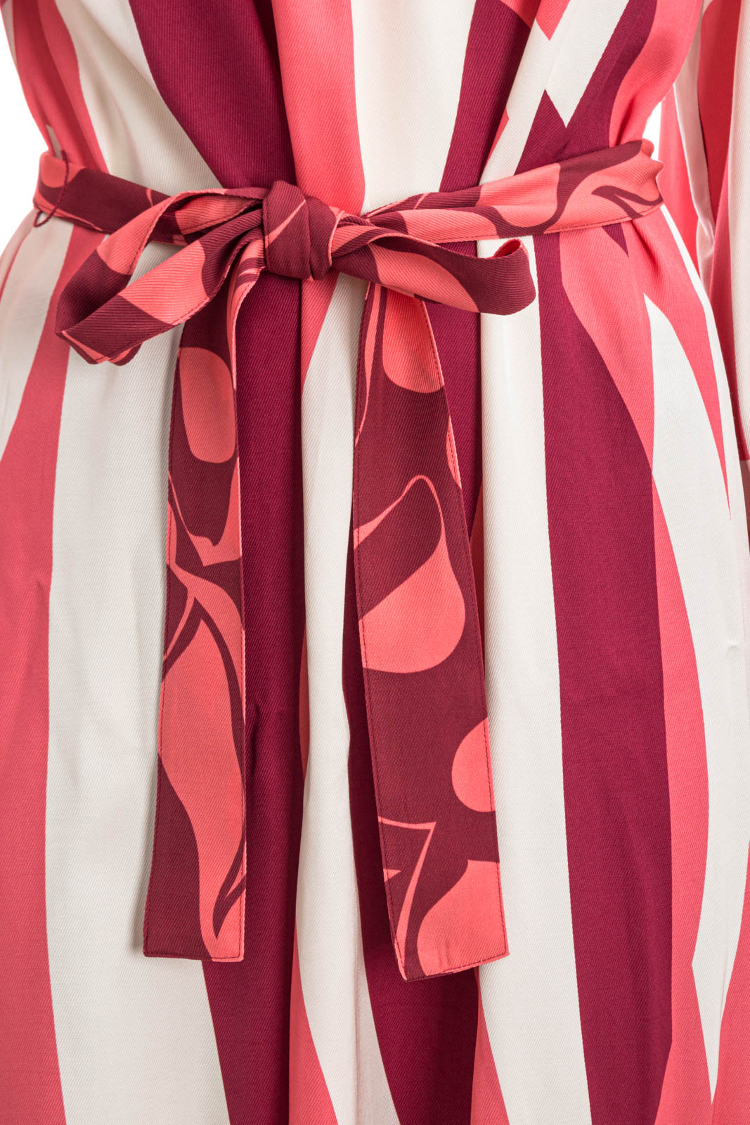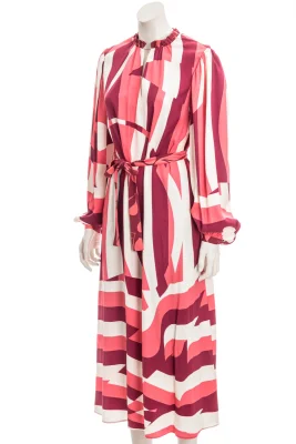 Markantes BOSS Kleid mit langen Ärmeln. Das elegante Kleid aus einem fließenden Material-Mix ist mit einem Signature-Streifen-Print bedruckt. Ein Bindegürtel, geraffte Ärmelbündchen und ein gerüschter Ausschnitt ergänzen das Design.