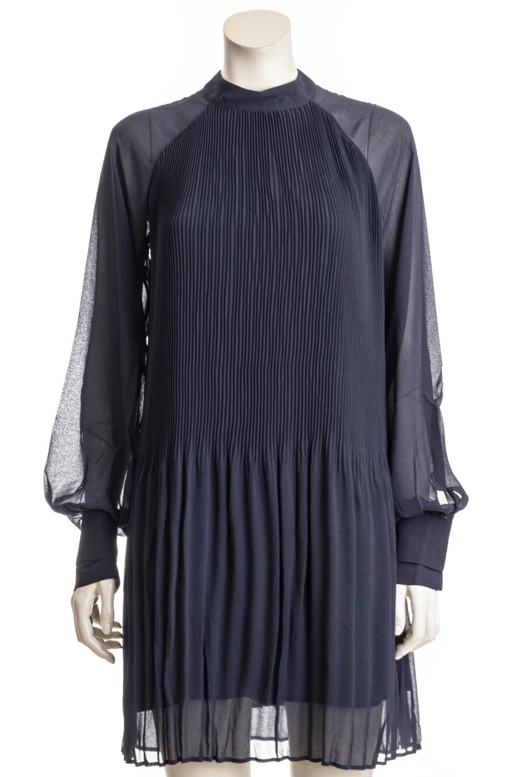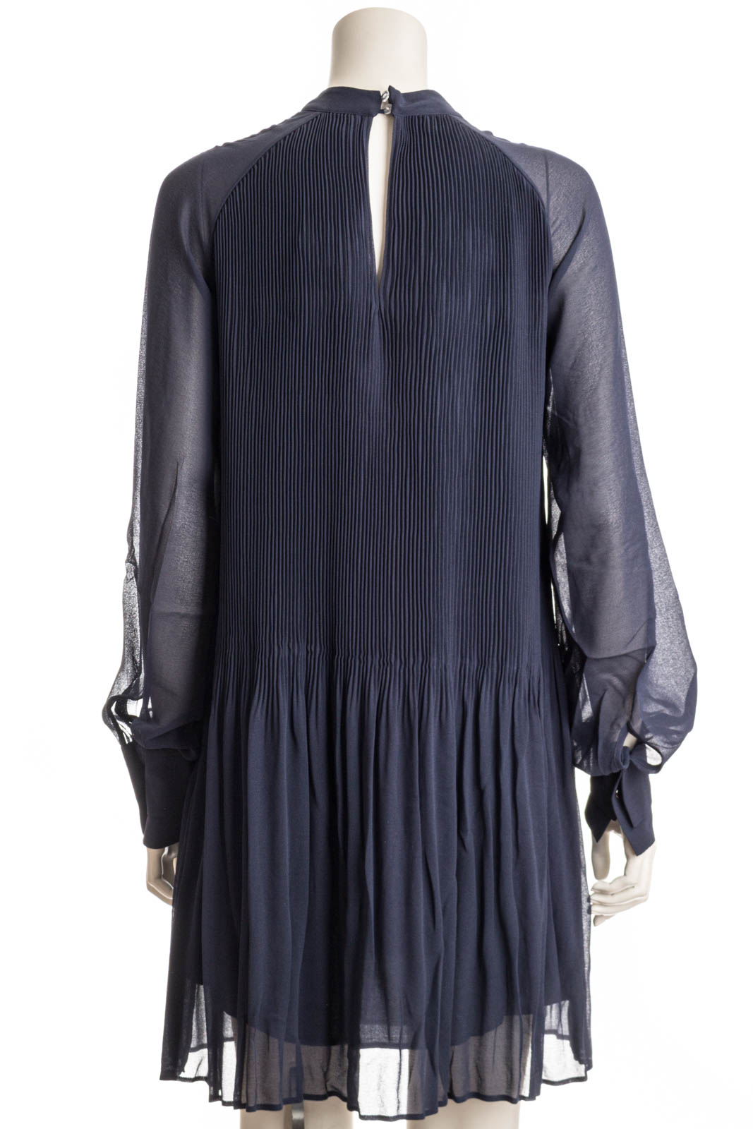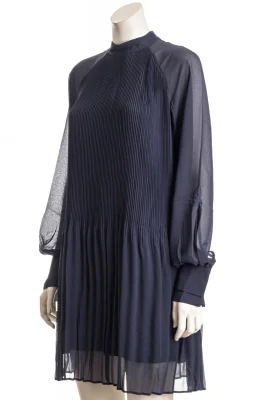 Elegantes BOSS Kleid mit Plissee-Falten. Der markante Style ist mit transparenten Ärmeln, einem hohen Ausschnitt und einem Schlüsselloch-Detail auf der Rückseite versehen.