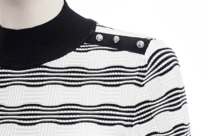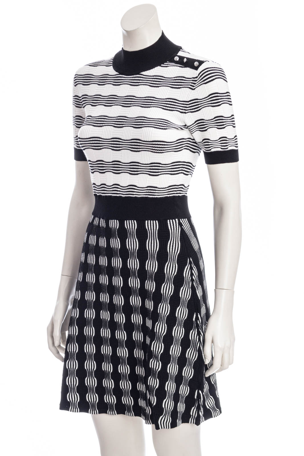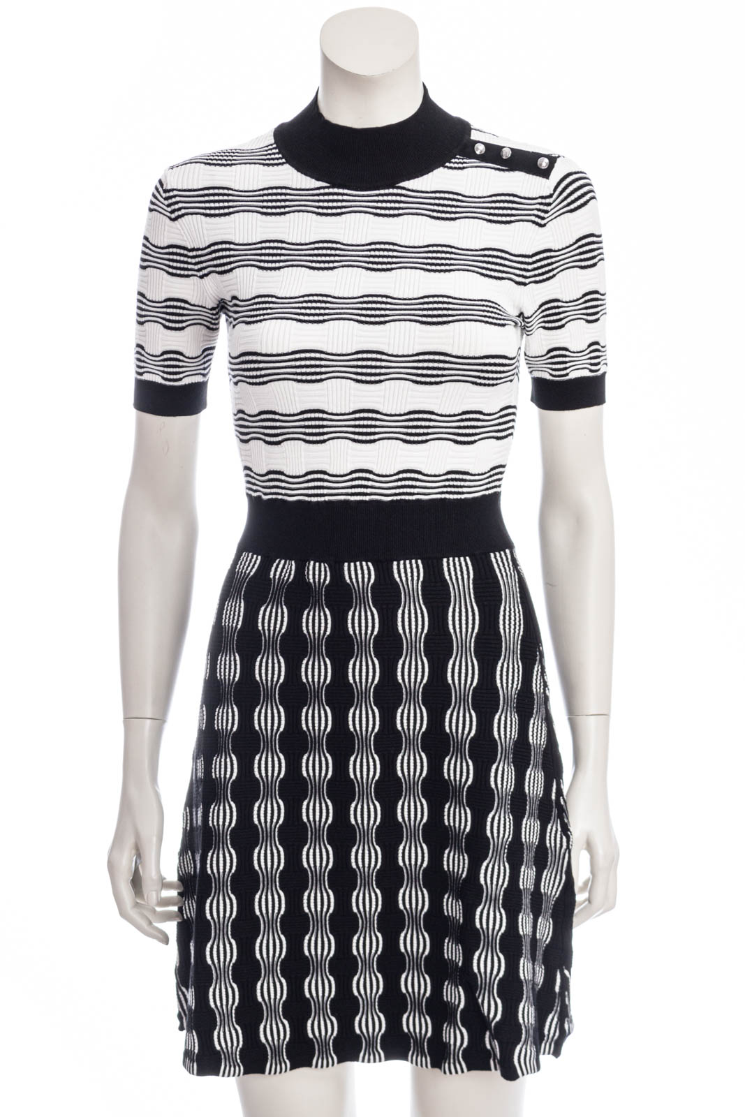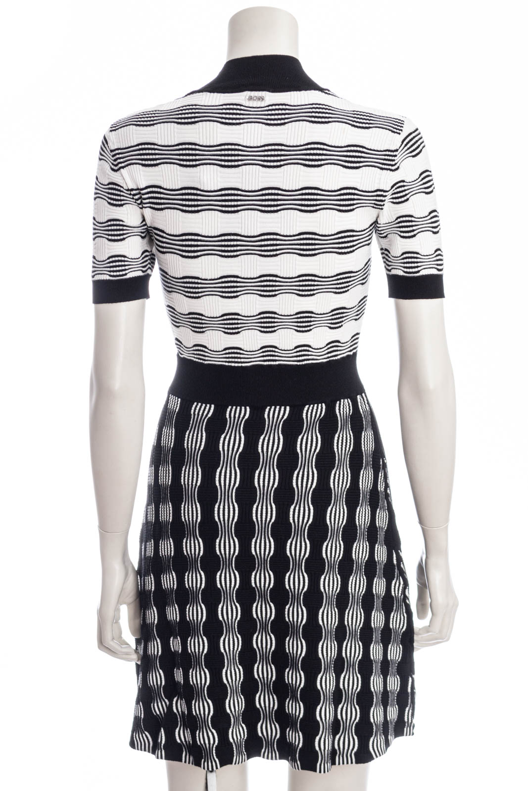 Vielseitig kombinierbares BOSS Kurzarm-Kleid mit gerader Passform. Der Damen-Style aus einem Material-Mix mit gestrickter Struktur verfügt über Logo-Knöpfe an den Schultern und einen hochgeschlossenen Ausschnitt.