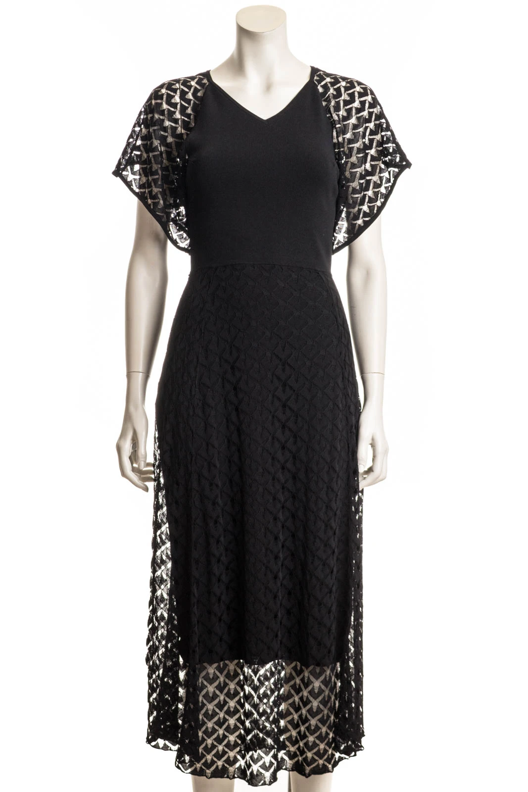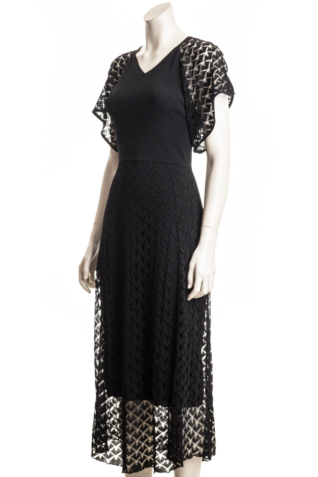 Dieses Maxikleid mit leicht transparenten Ärmeln bietet einen eleganten Look. Das Design zeichnet sich durch einen V-Ausschnitt und ein figurbetontes Oberteil aus, das in einen dezent gemusterten Rock übergeht und eine elegante Silhouette erzeugt.