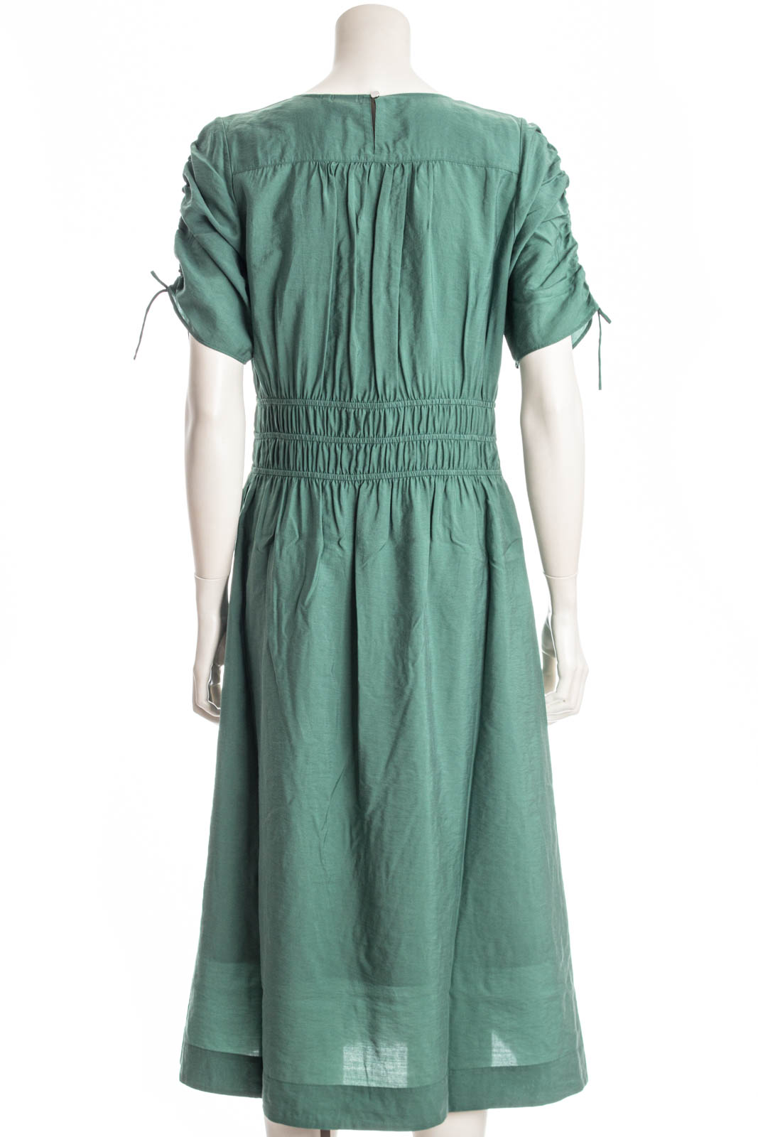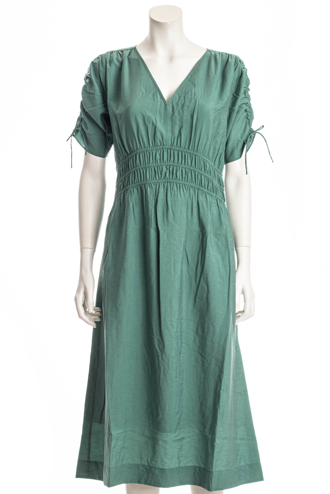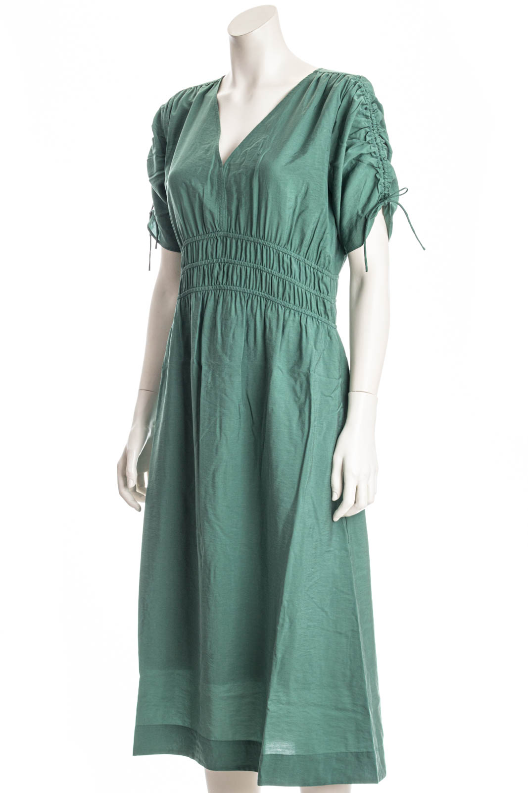Schmal geschnittenes BOSS Midikleid aus softem Canvas mit V-Ausschnitt, elastischer Taille und gerafften Ärmeln.
