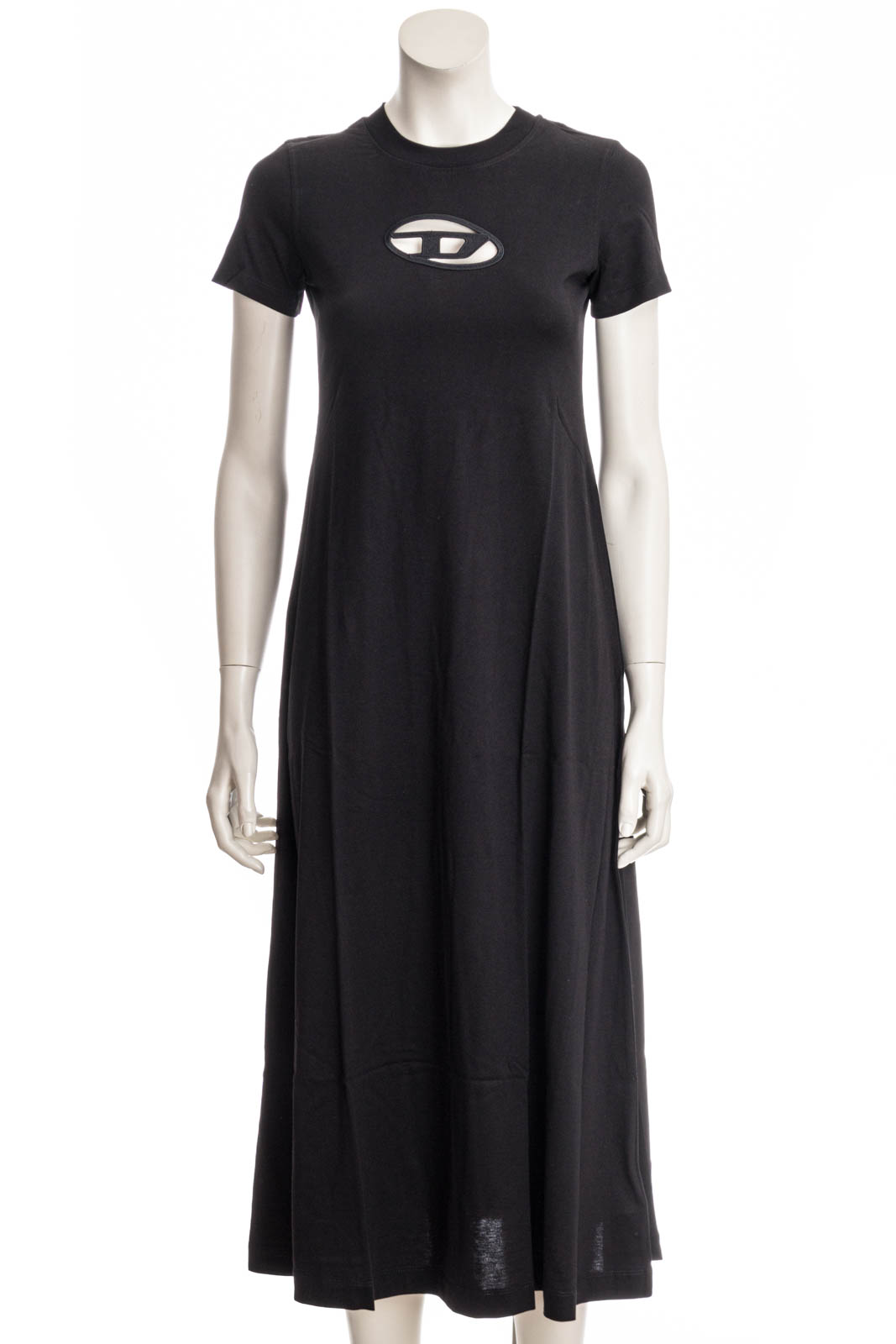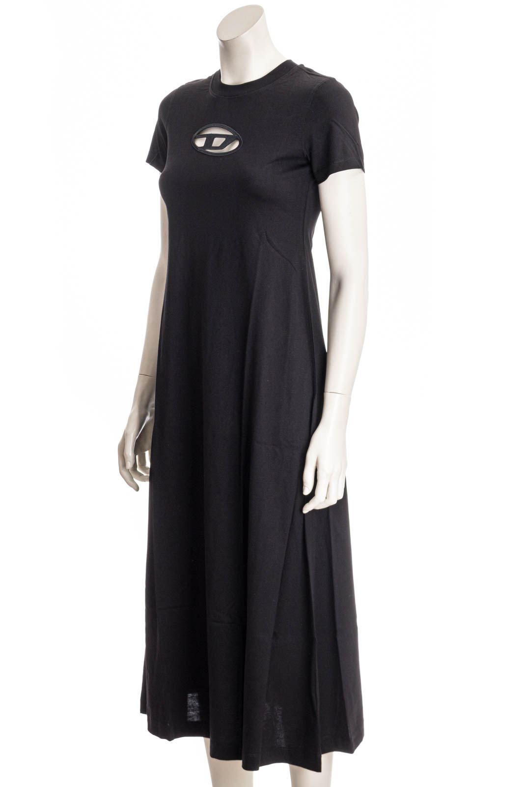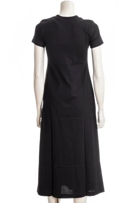 Langes Kleid mit kurzen Ärmeln und weitem Rockteil.