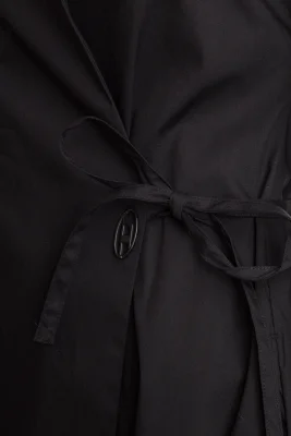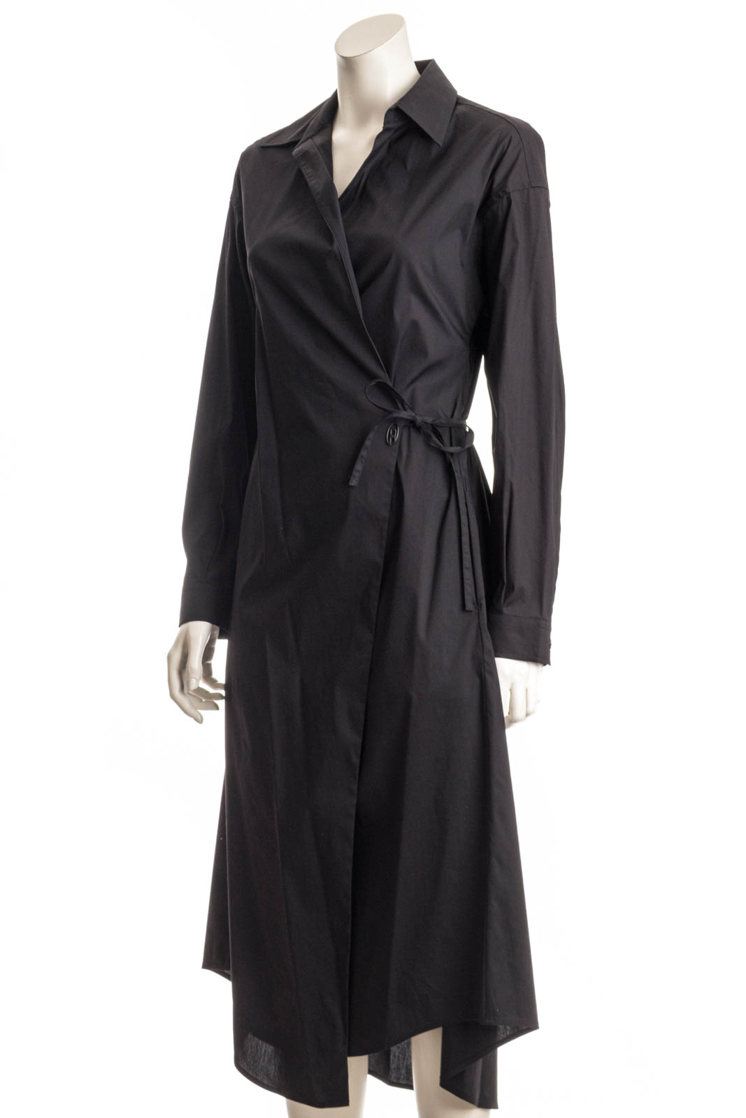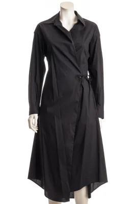 Midi-Shirtkleid für Damen aus Baumwollmisch-Popeline. Die geraffte Wickel-Silhouette hat einen asymmetrischen Saum und einen Oval D-Anhänger aus Metall, der den Bund ziert.