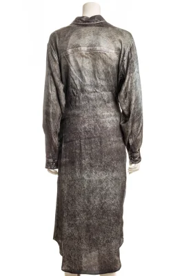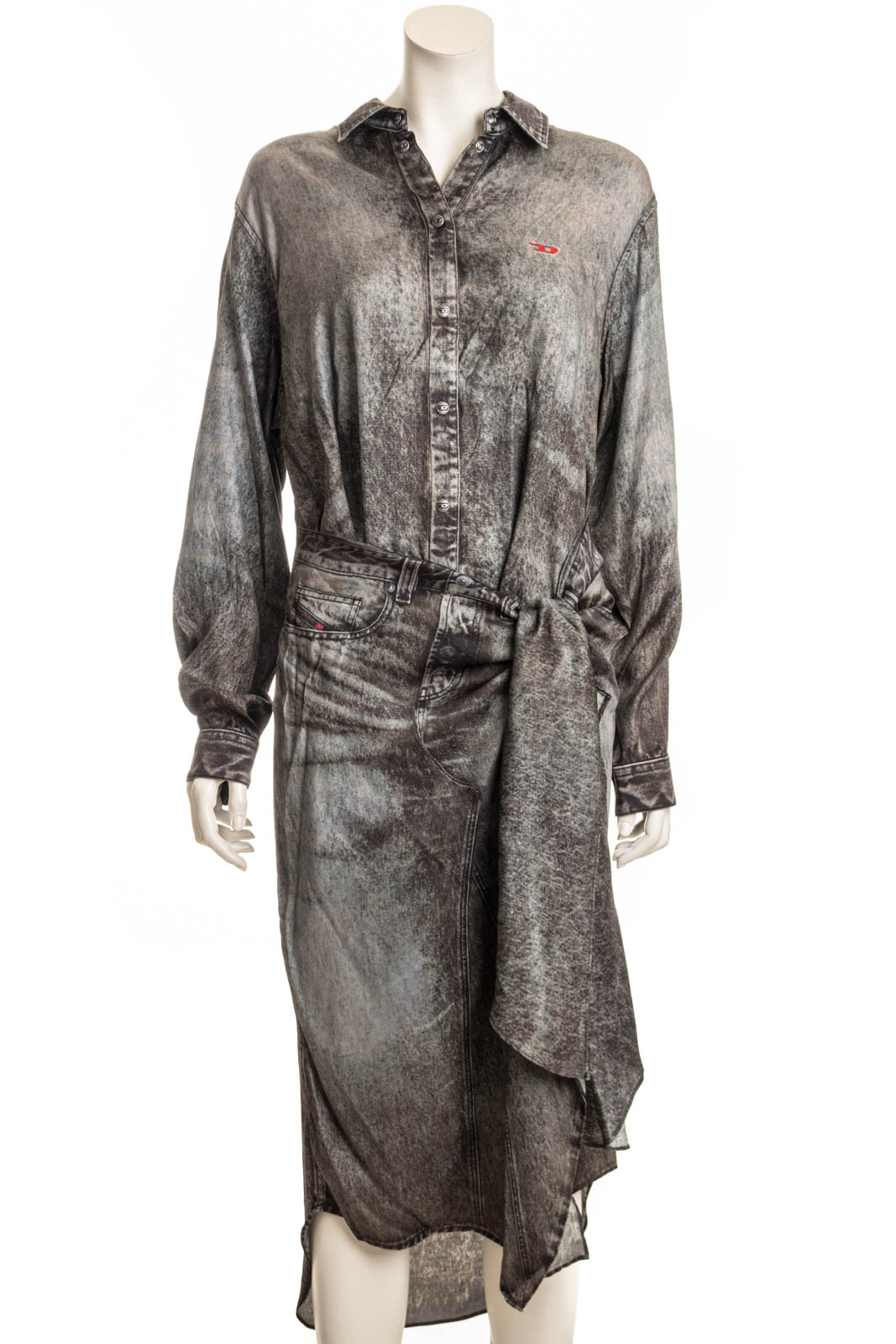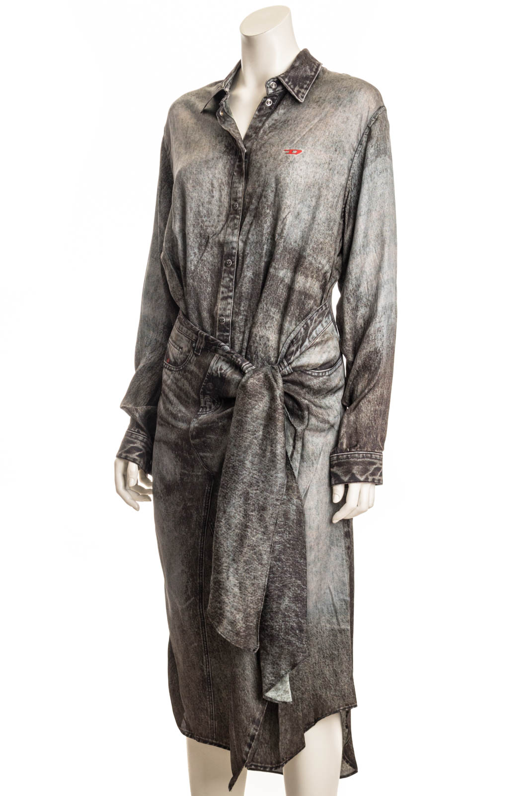 Entspanntes Hemdkleid für Damen mit asymmetrischer Wickelfront. Das fließende Viskosegewebe — zur Hälfte aus verantwortungsbewussten Quellen und zur Hälfte aus ECOVERO™ -Fasern — sieht aus wie ausgewaschener schwarzer Denim und ist mit Trompe l'œil-Five-Pocket-Details versehen.