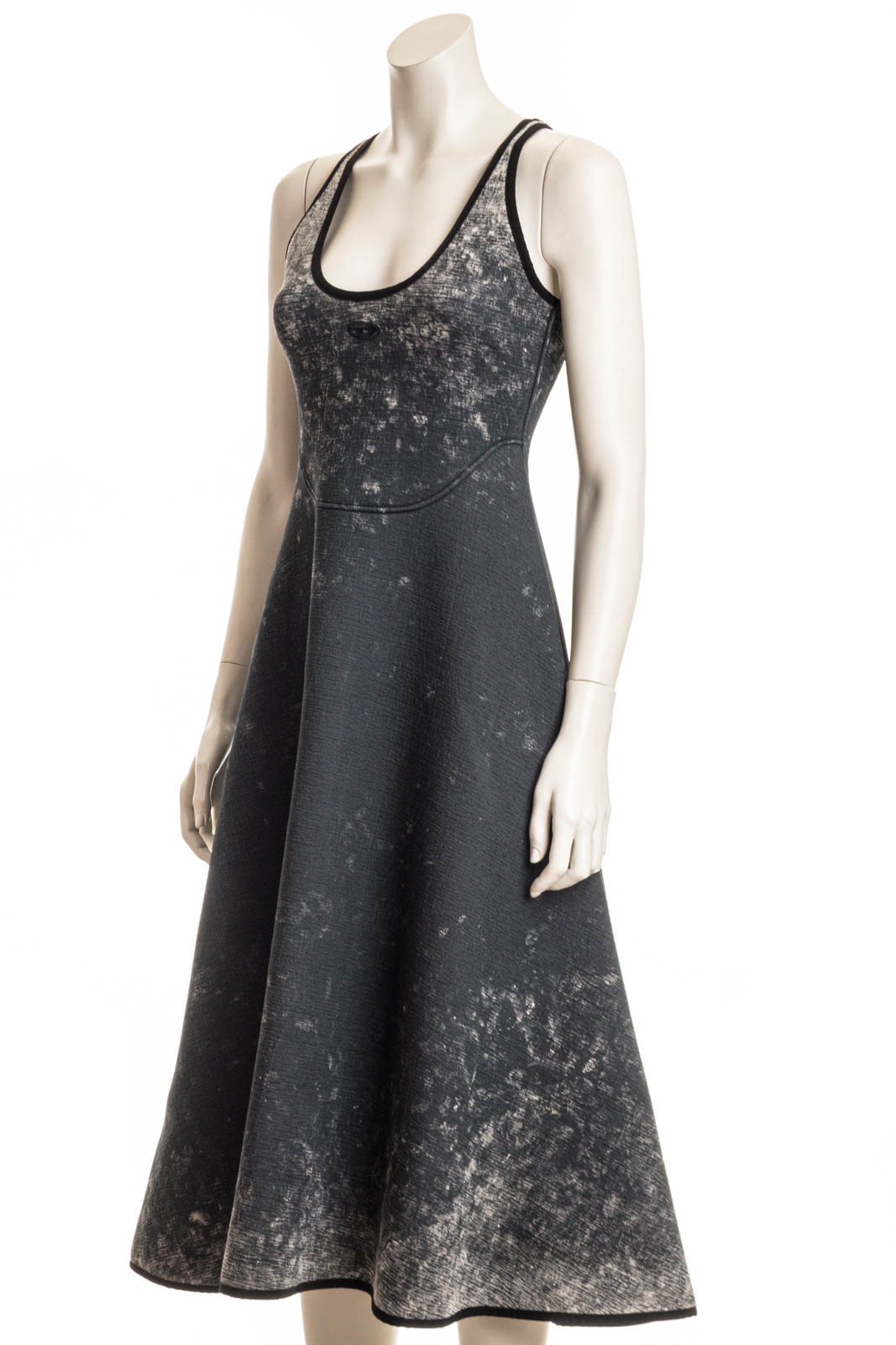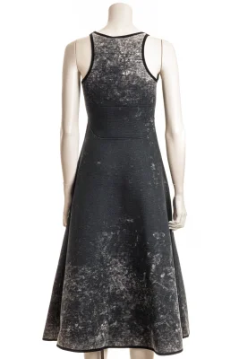 Dieses Midi-Kleid aus formstabilem Scuba, hergestellt aus 82 % Bio-Baumwolle. Innen behandelt für einen dégradé-marmorierten Effekt auf der Außenseite, schmiegt sich dieser Stil an den Körper, bevor er in einen Glocken-Rock ausläuft.