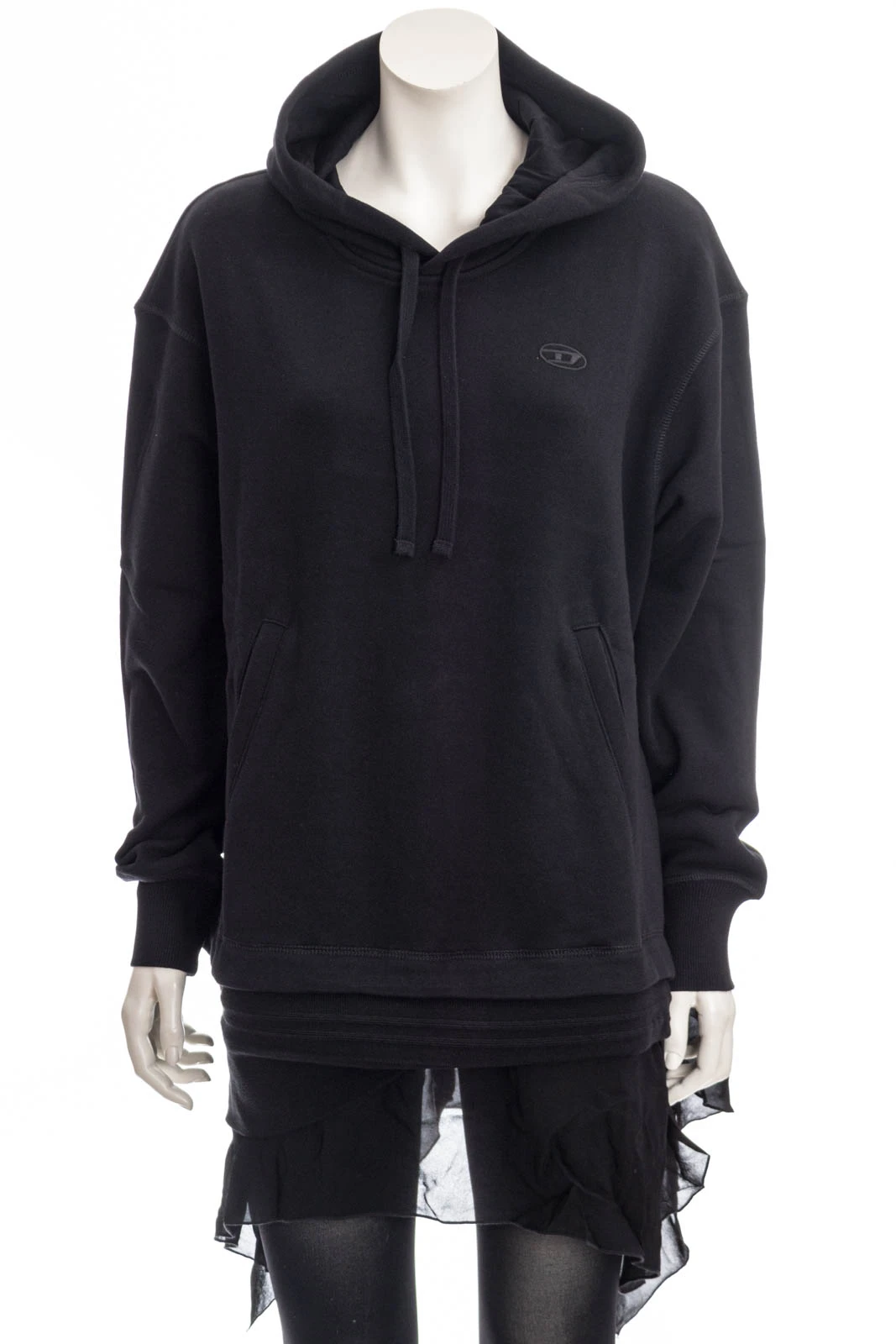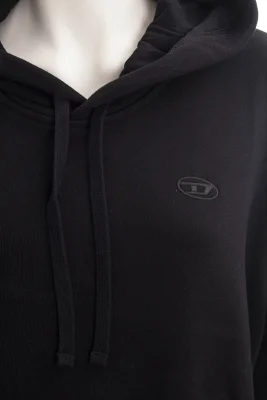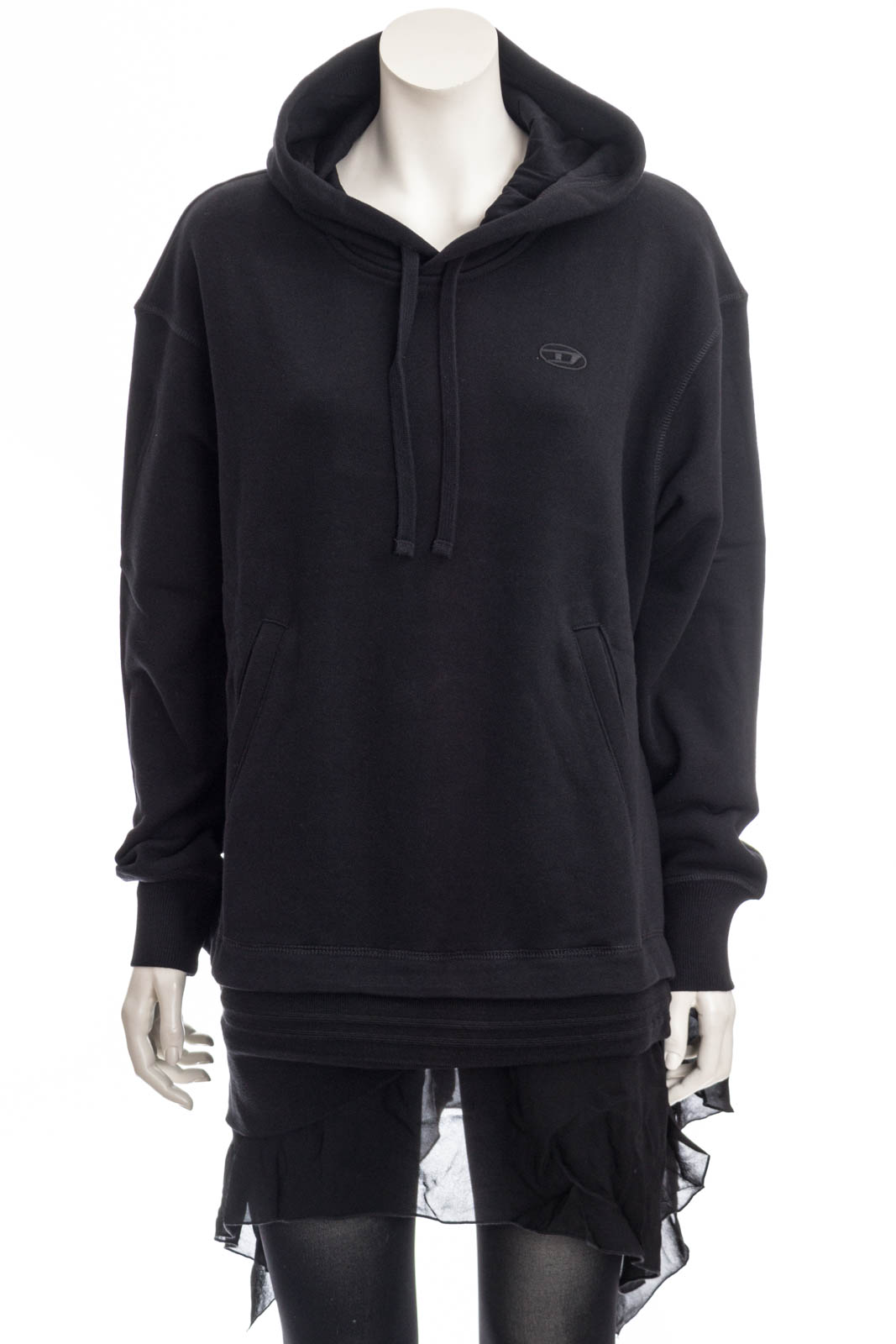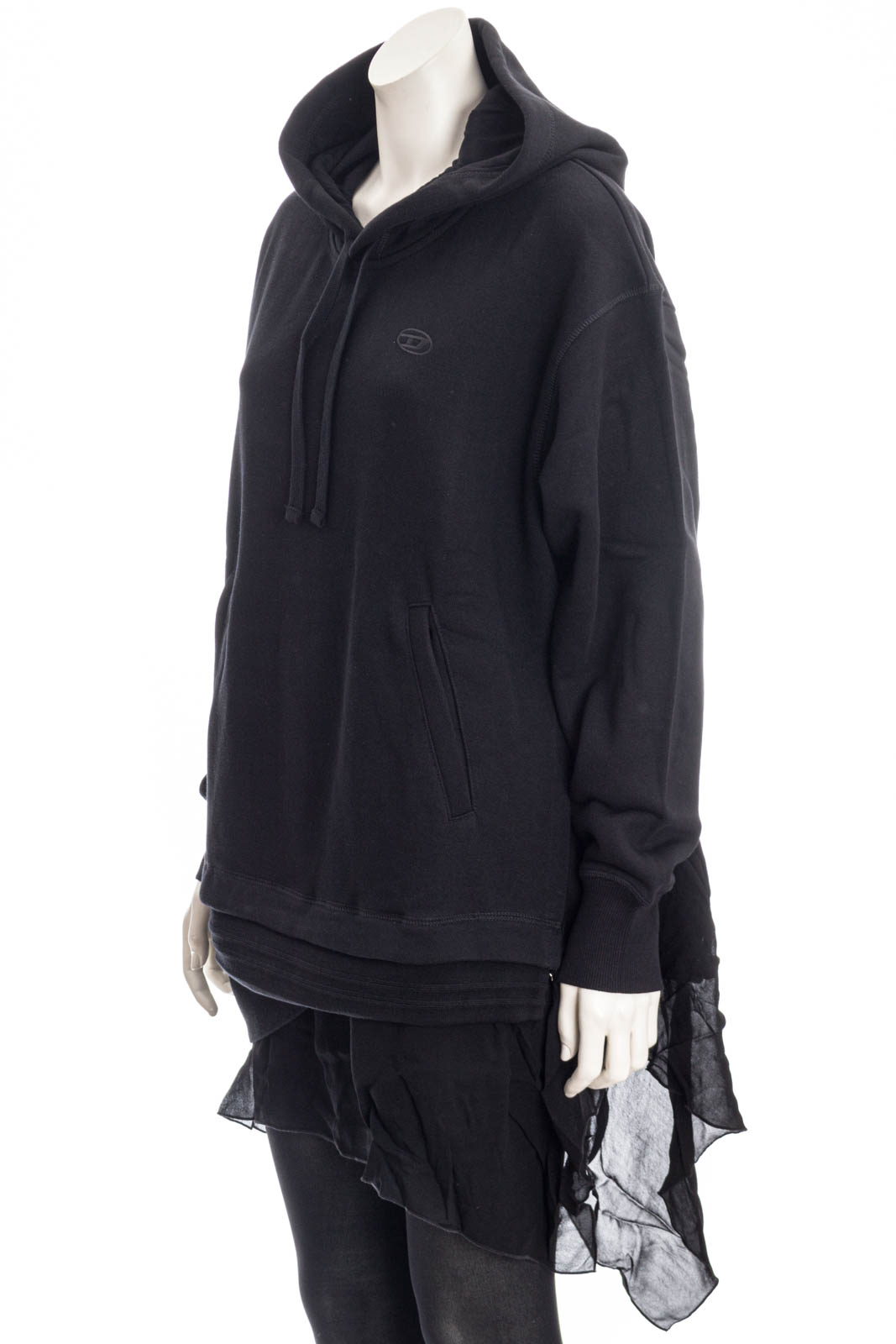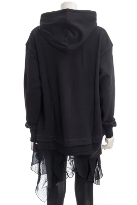 Asymmetrisches Kapuzen-Kleid fĂĽr Damen im Stil eines XXL-Sweatshirts mit Schlitz auf einer Seite und Tunnelzug zum Anpassen des Saums.