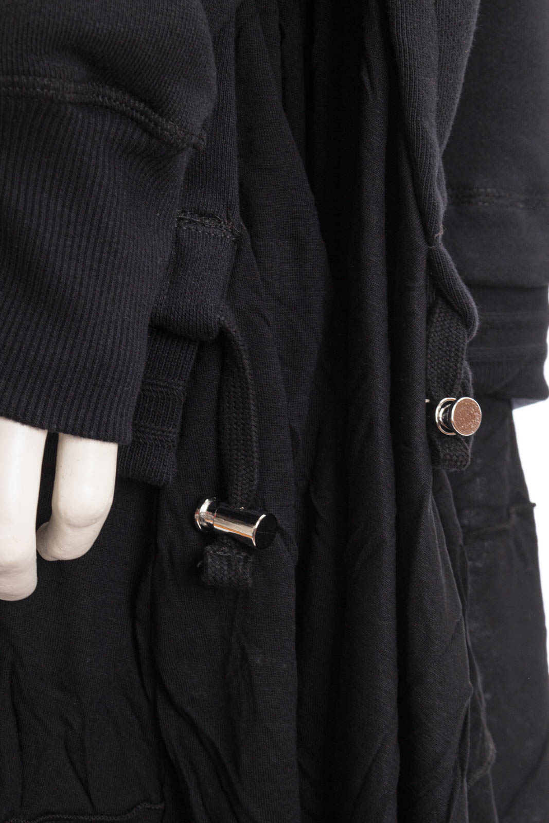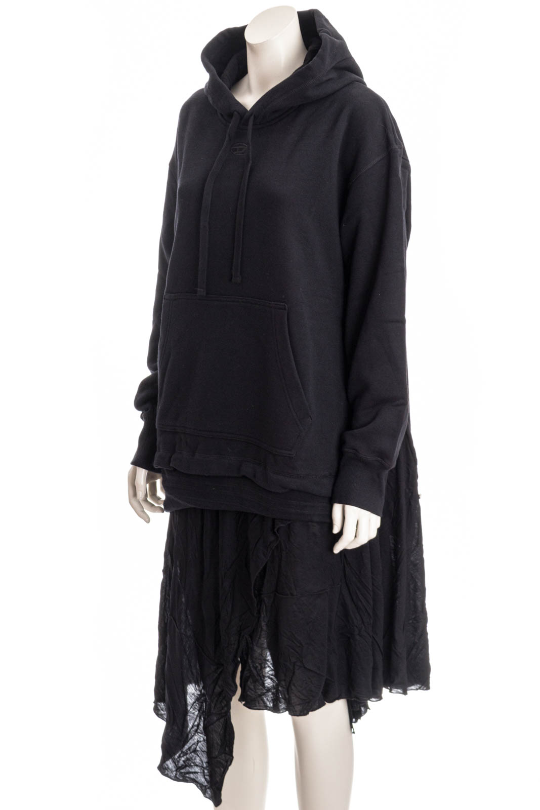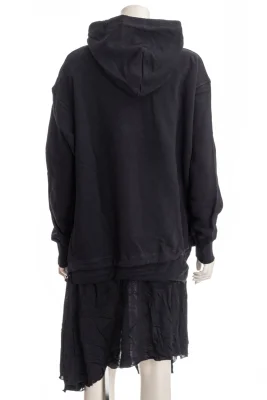Hybridstyle aus ĂĽbergroĂźem Hoodie und flieĂźendem Rock: kurzes Kleid aus Baumwolle mit Kapuze mit unverarbeiteten Kanten und asymmetrischer Kante aus Chiffon, die am geschlitzten, verstellbaren Saum hervorblitzt.