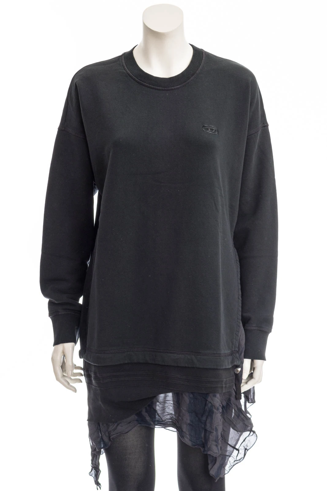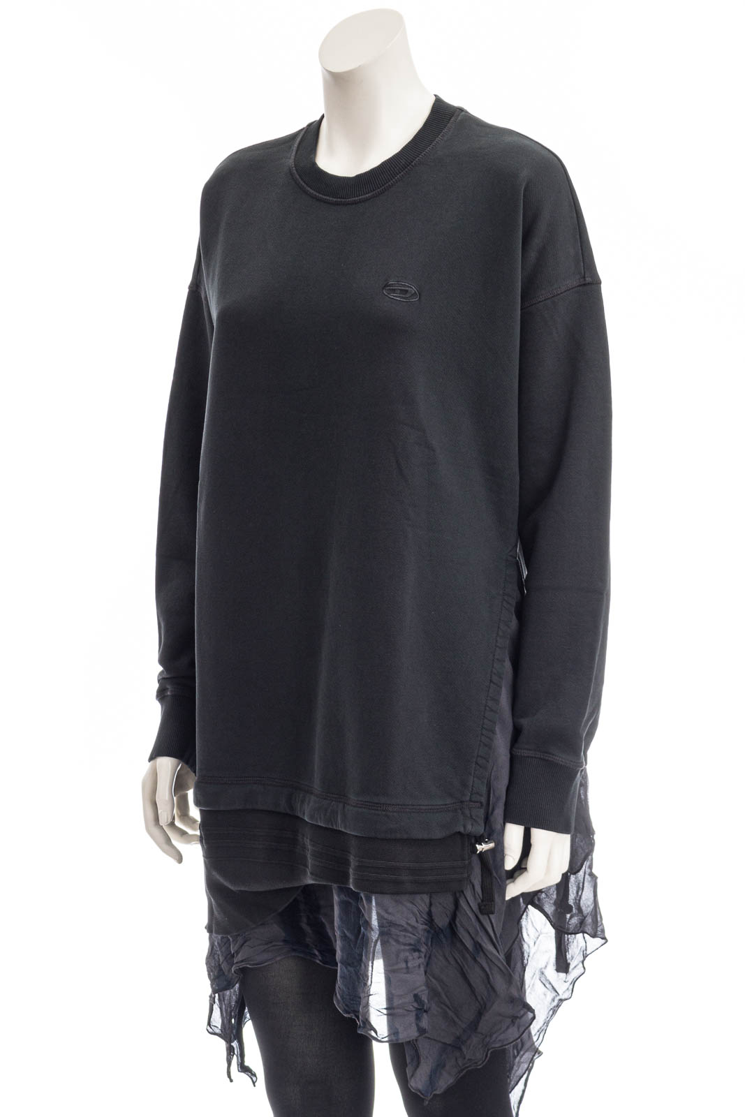 Modisches Sweatshirtkleid mit DIESEL-Logo auf der Brust. Die Kante aus Chiffon flieĂźt aus einem mehrlagigen, einseitig geschlitzten Saum mit Tunnelzug.