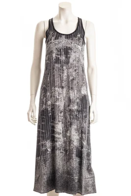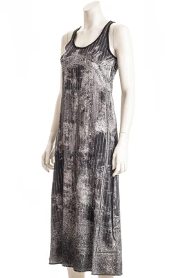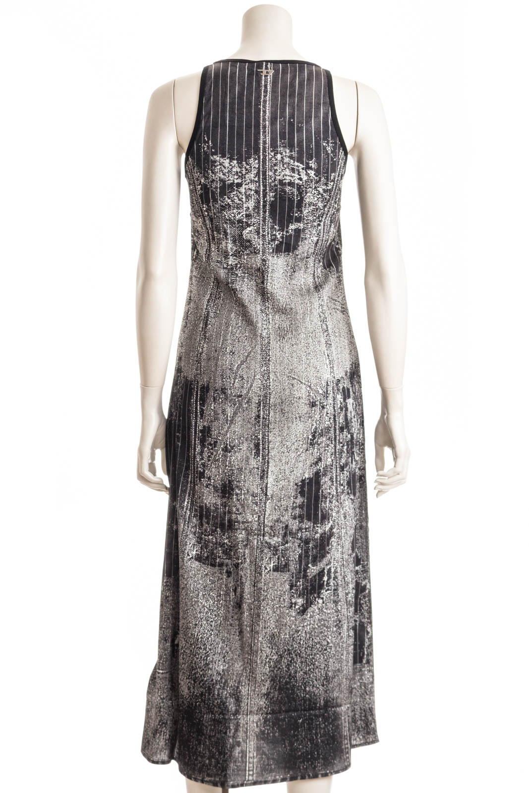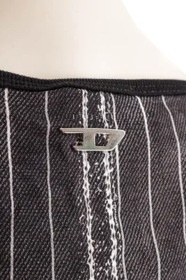 Dieses schwarze Midi-Kleid für Damen ist mit einem Trompe-l'Œil-Print versehen, der an den Nadelstreifen-Dévoré-Denim-Look von Diesel vom Runway Frühjahr 2024 erinnert.