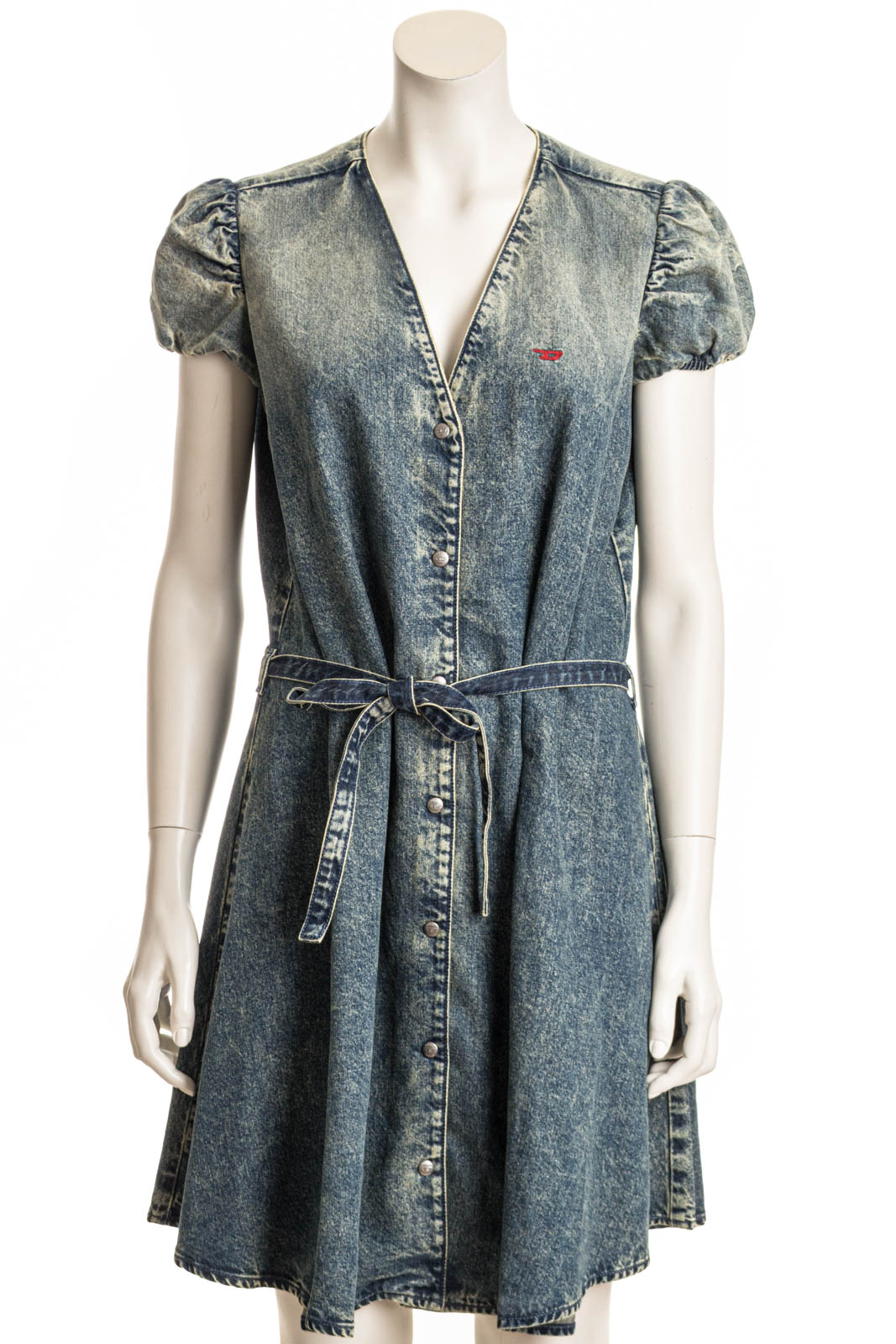 Kleid aus Denim mit V-Ausschnitt und Knopfleiste vorne. Aus Lyocell gefertigt, hat es dank der Säurewäsche einen modernen Used-Look. Der verstellbare Gürtel betont die Silhouette und die kurzen Puffärmel verleihen Charakter. Auf der Brust befindet sich das kontrastierend gestickte Oval-D-Logo als Detail.