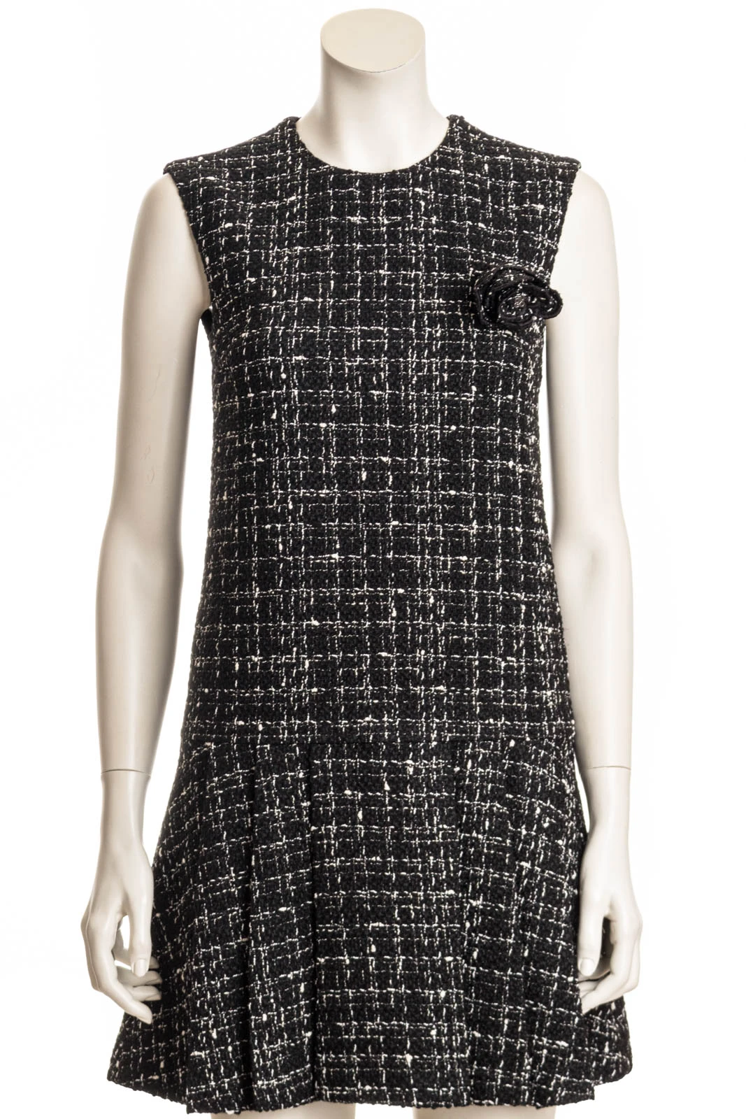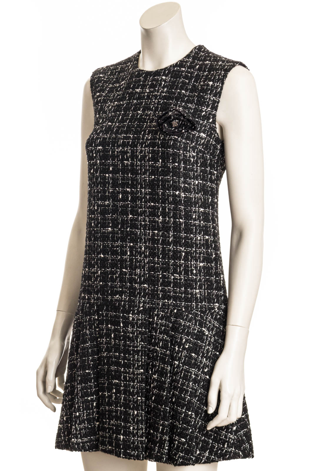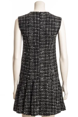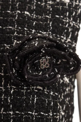 Dieses ärmellose Bouclé Kleid hat einen taillierten Schnitt. Eine abnehmbare Brosche und Liegefalten am Rockteil machen das Klleid zu einem Must-Have der Saison.