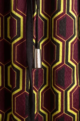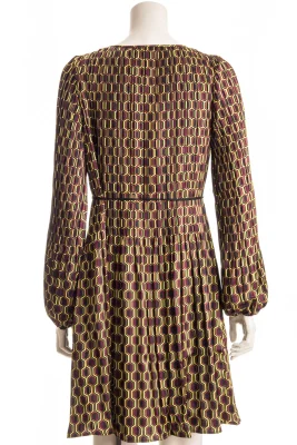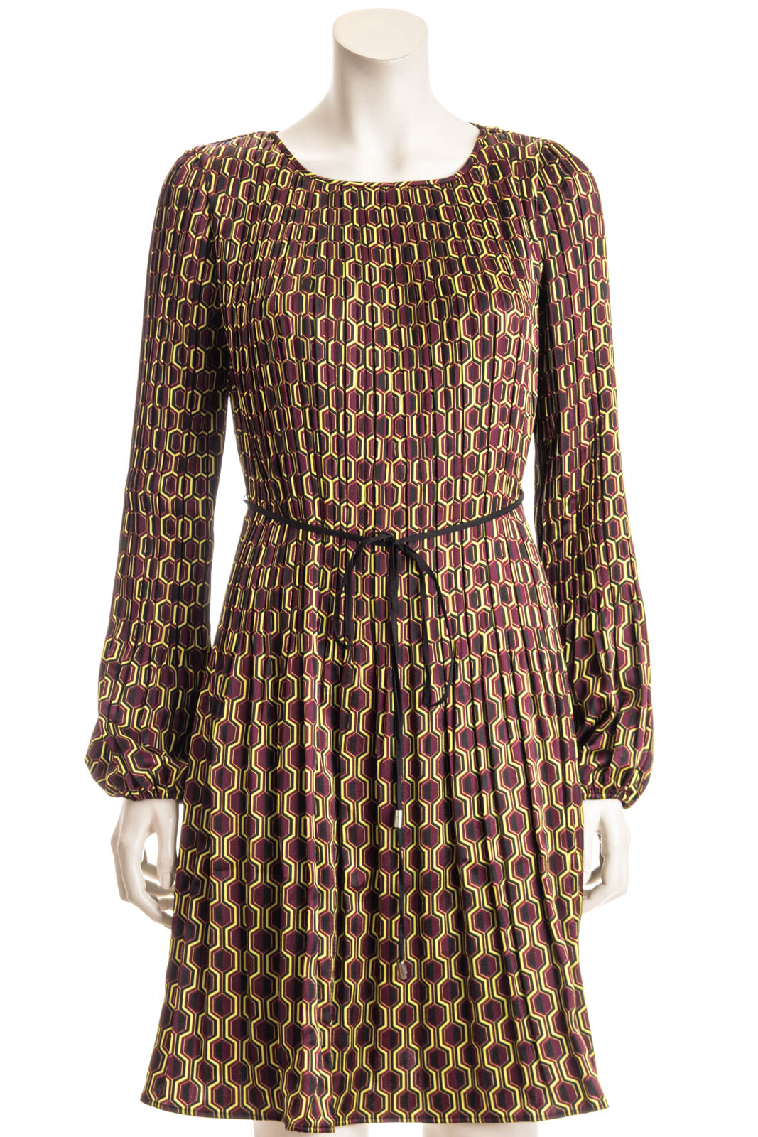 HUGO Kleid mit Gürtel und weiten Ärmeln. Der vielseitig kombinierbare Style ist aus einem Material-Mix mit Plissee-Falten gefertigt, der elegant fällt und mit einem geometrischen Print bedruckt ist.