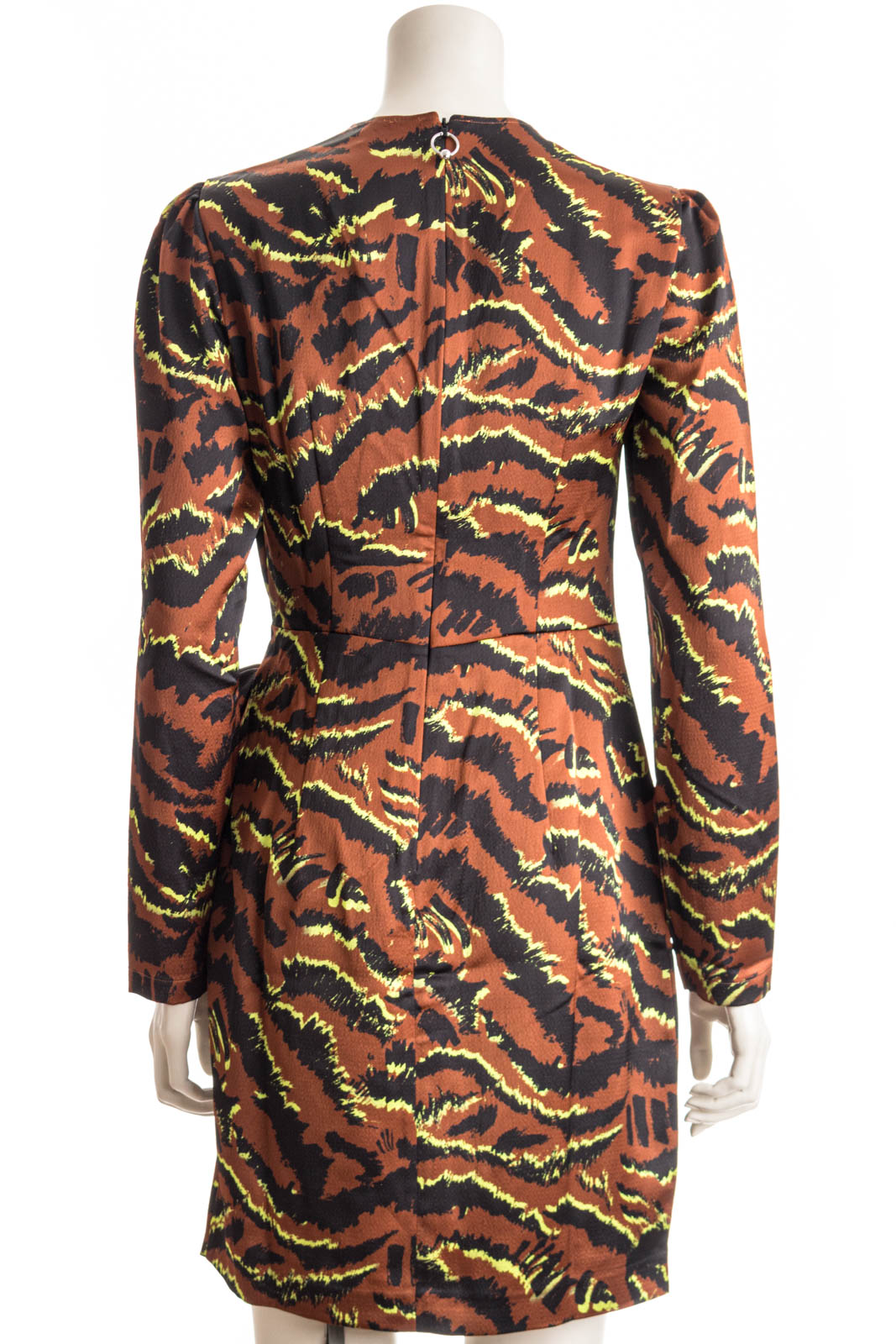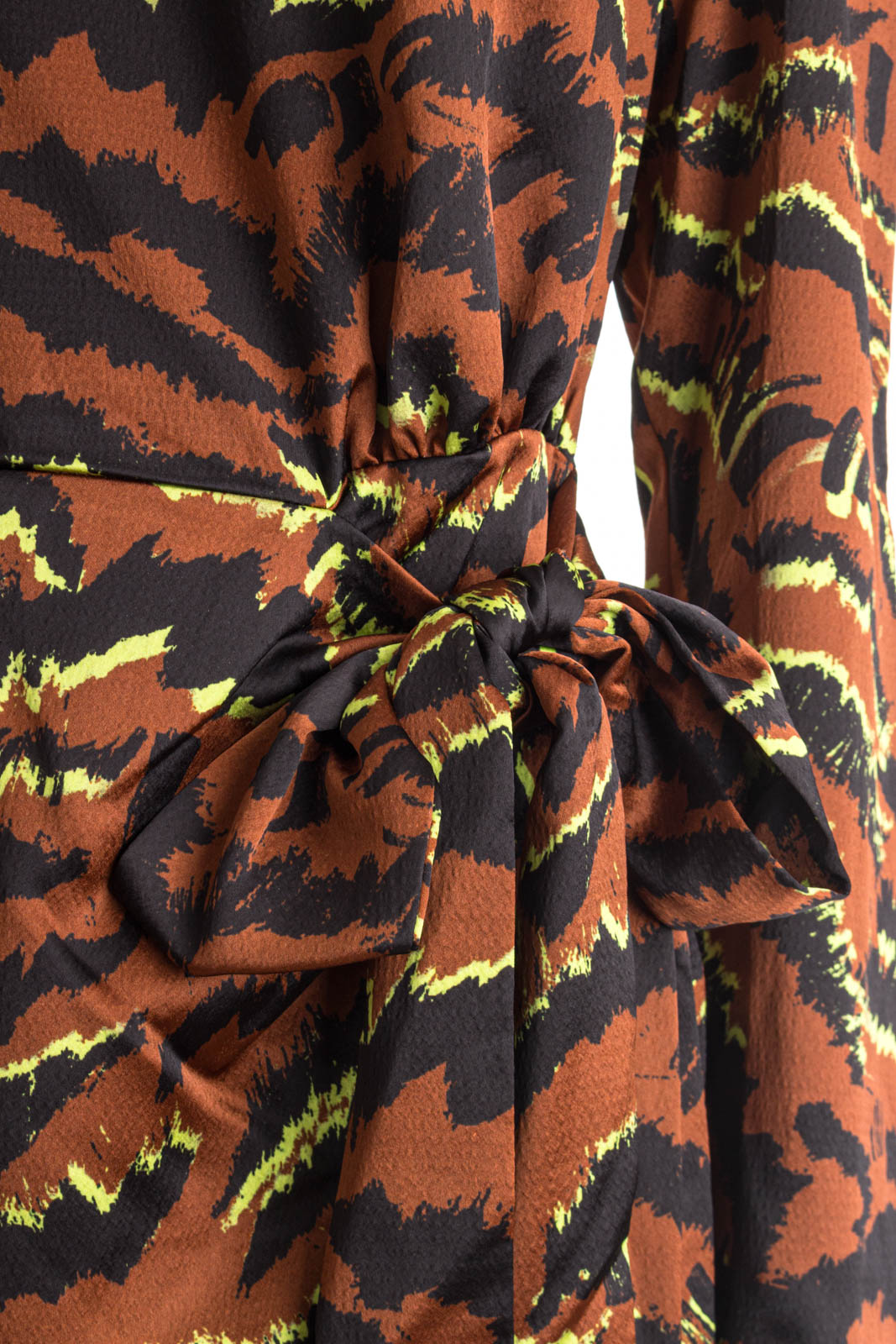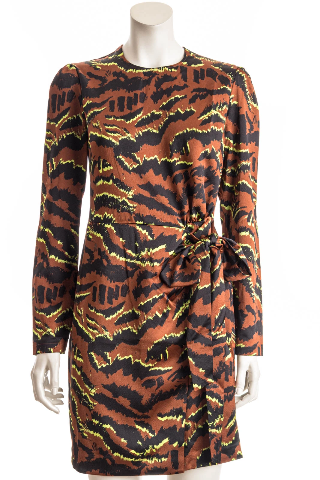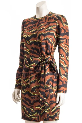 Dieses Kleid besticht durch sein auffälliges Design und den taillierten Schnitt in A-Linie. Das Bindedetail auf Taillenhöhe und der satinierte Stoff machen dieses Kleid zu einem wahren Blickfang.