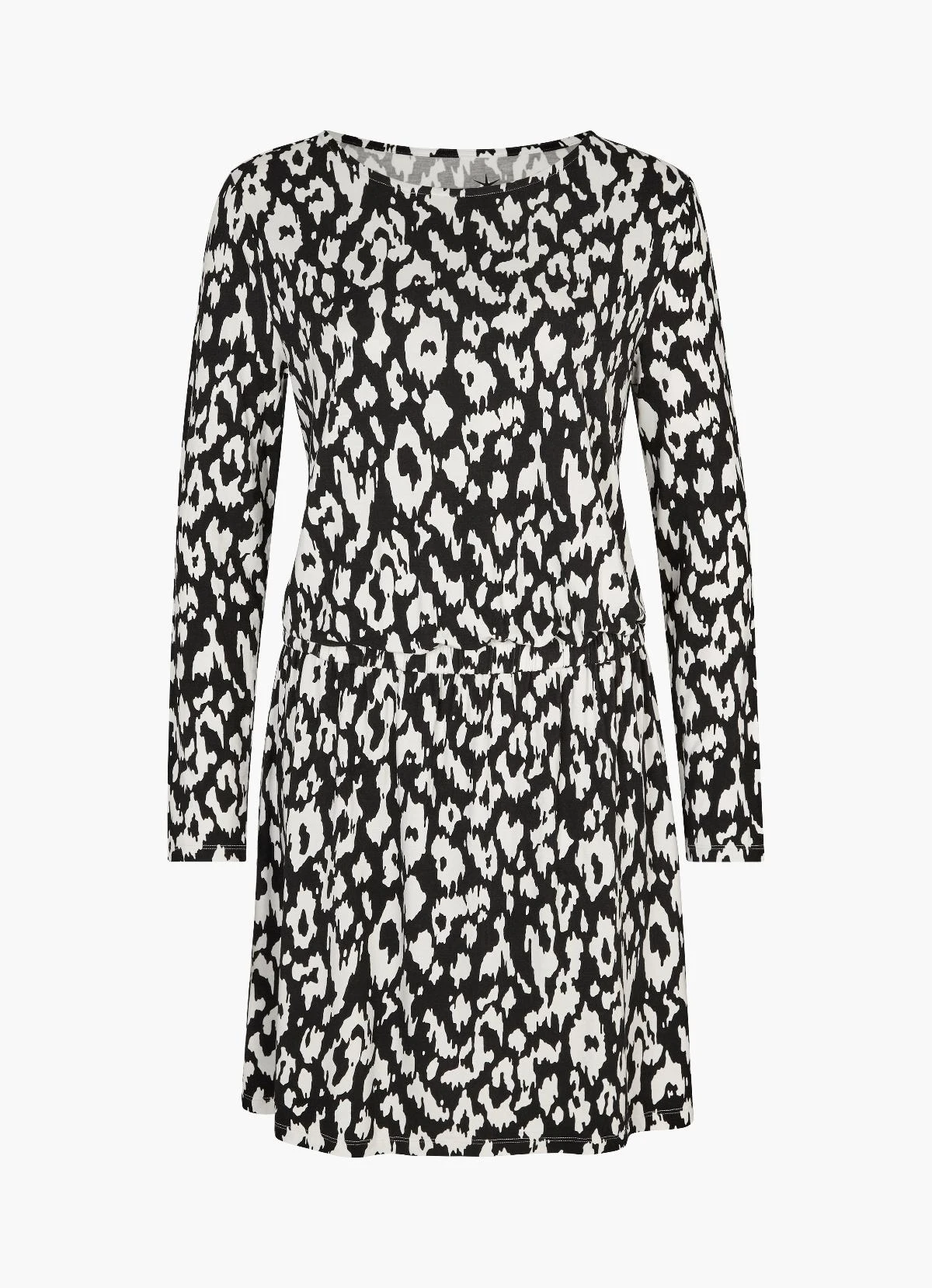 Der leichte Viskose-Jersey zeichnet das feminine schwarze Kleid im „Ethno Leo“ Allover-Print als cosy Style aus. Lange Ärmel, ein klassischer Rundhalsausschnitt und die elastische Taillenpartie runden das ausgestellte Design stimmig ab.