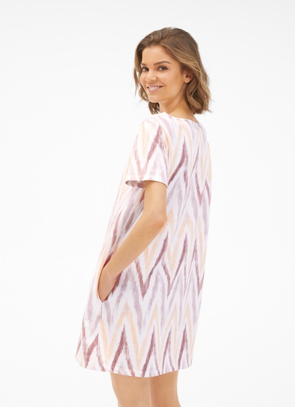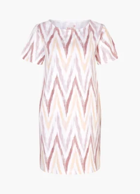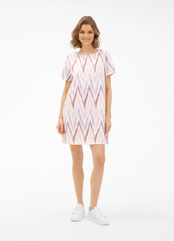 Das kurzärmelige Kleid begeistert im labeltypischen „Zig Zag“ Allover-Design im Mix aus White und kontrastiven Nuancen. Für einen klassischen Twist sorgt der Rundhalsausschnitt, ergänzt durch nahtverdeckte Taschen. Der Look erhält durch die superweiche Devoré-Qualität pure Comfiness.