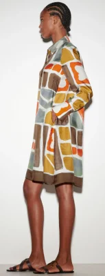 Locker fallendes, leicht ausgestelltes Hemdblusenkleid mit exklusivem Allover-Print im Ethno-Stil. Das Kleid wurde aus sommerlich leichtem Seidensatin gefertigt und ist mit edel schimmernden Knöpfen aus Perlmutt versehen.
