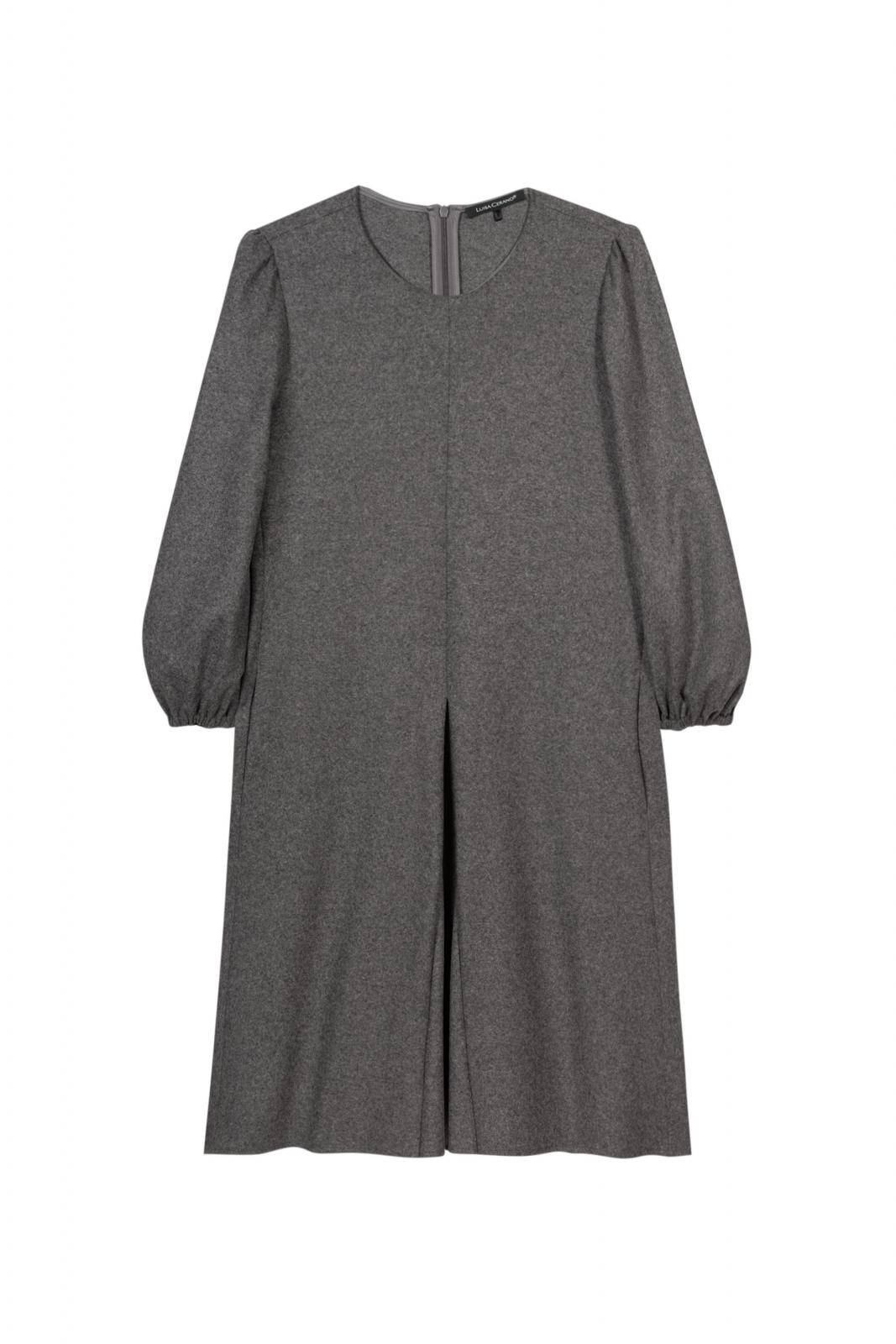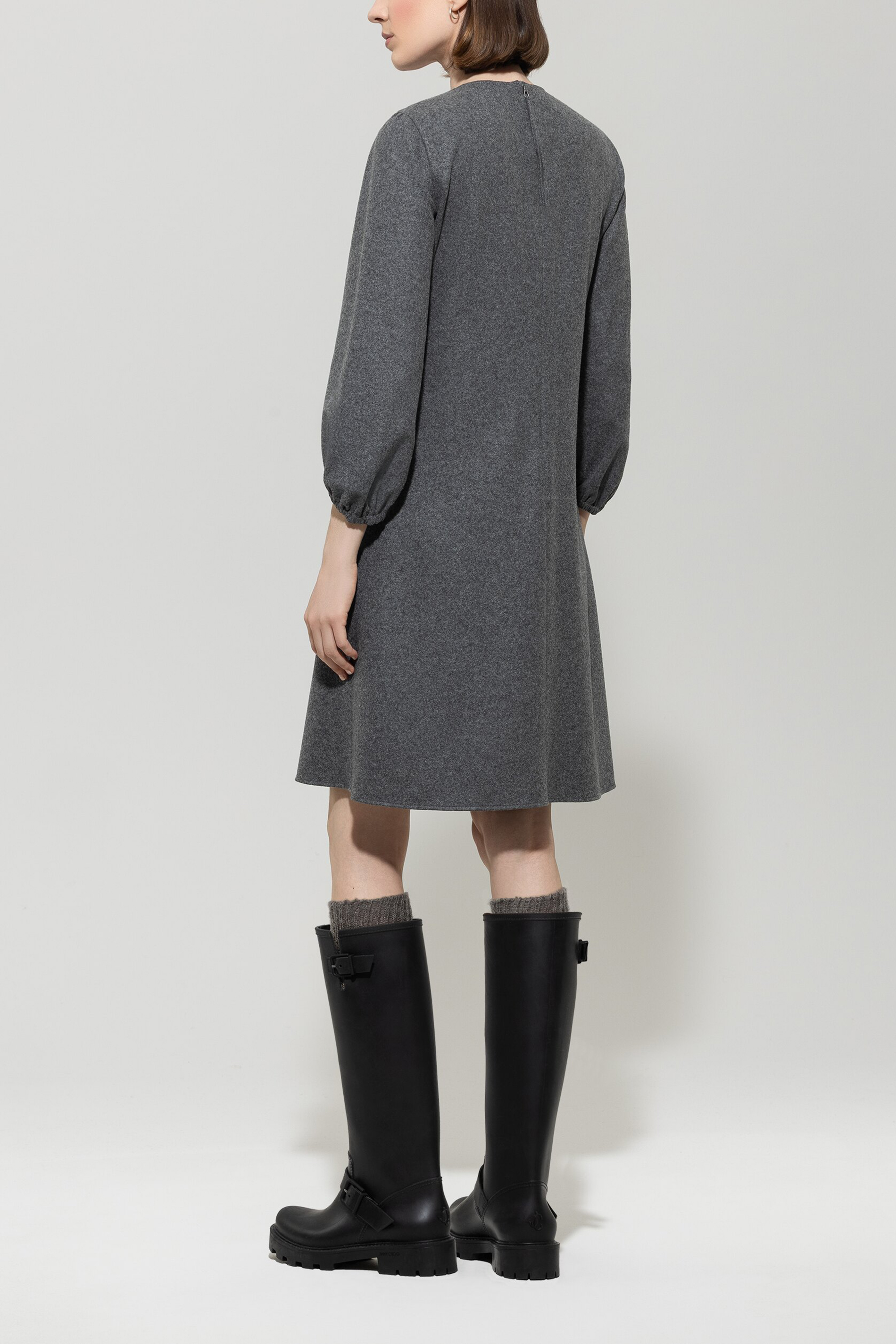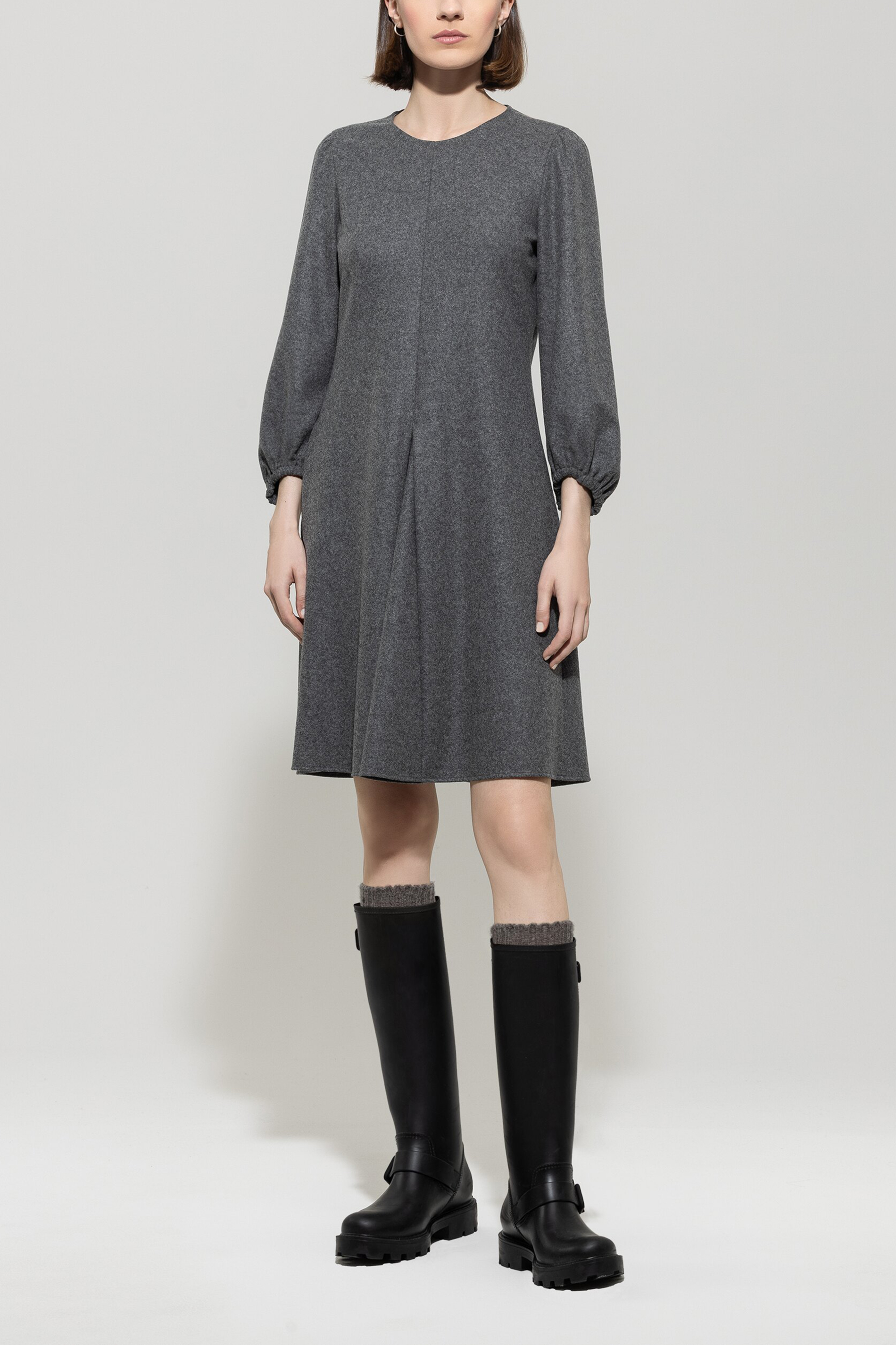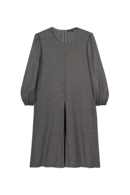 Kurzes Kleid aus Wollflanell-Jersey in Melange-Optik. Der gerade Schnitt wird durch einen runden Halsausschnitt, einen formgebenden Keileinsatz auf der Vorderseite und voluminösen, ¾-langen Ärmeln mit elastischen Bündchen ergänzt.
