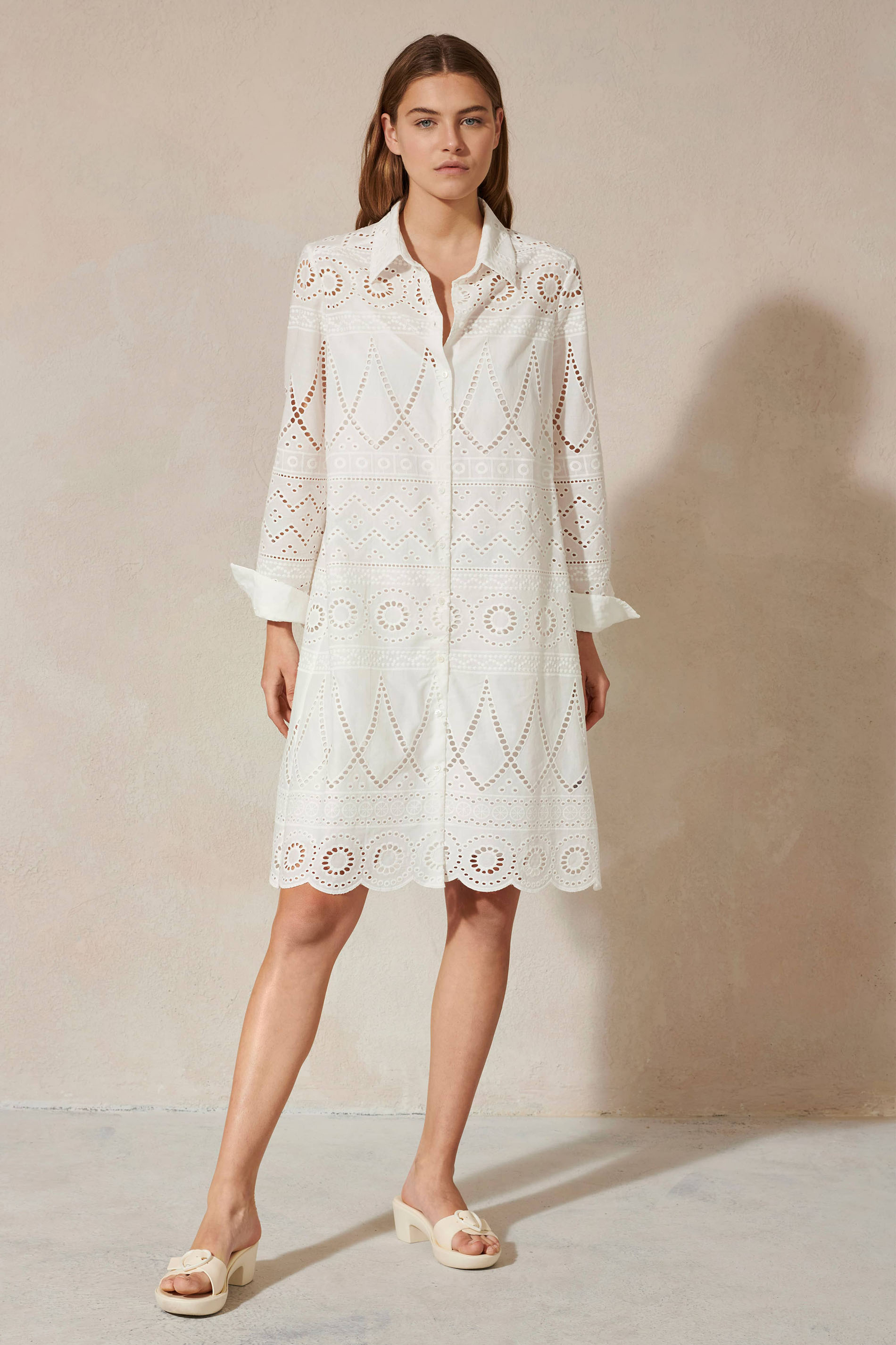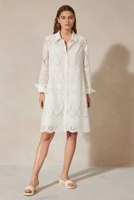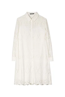 Hemdblusenkleid aus bestickter Baumwoll-Popeline. Bei dem langärmeligen Kleid trifft romantisches Design auf einen modernen, geraden Schnitt. Glänzende Perlmutt-Knöpfe runden die elegante Optik ab.